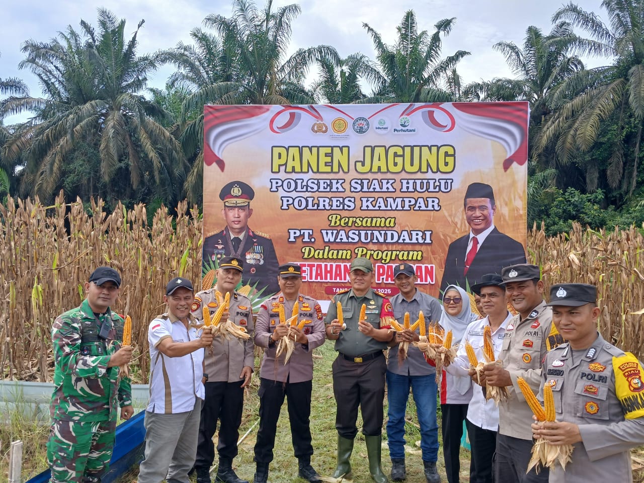 Melaksanakan Panen raya bersama di lokasi tanaman jagung seluas 1 Ha di Lahan kebun PT. Wasundari Indah sembari memberikan semangat kepada petani Jagung dan yang telah mendukung program Asta Cita Presiden RI oleh Kapolsek Siak Hulu AKP Hendra Setiawan, S.H
