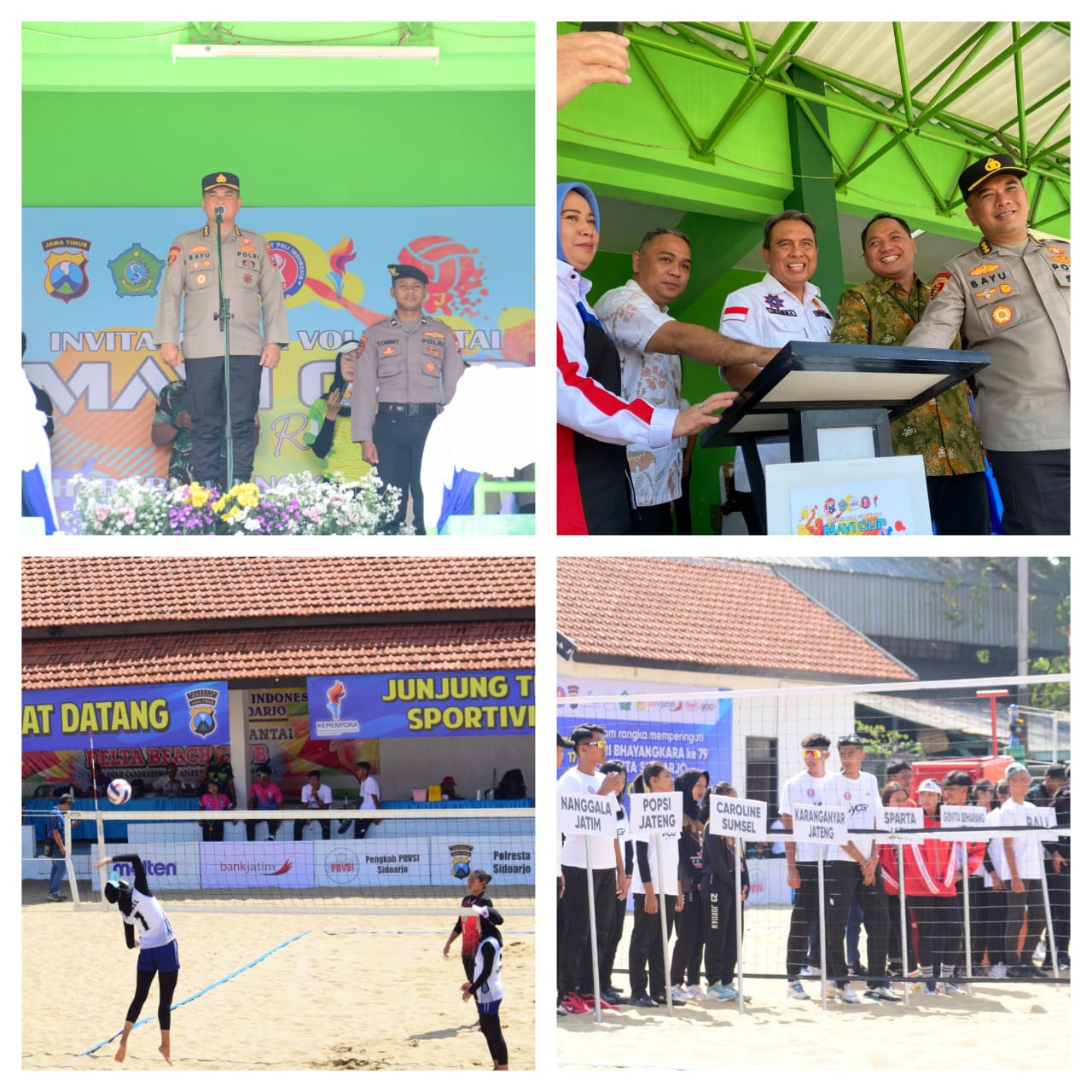 Memperingati Hari Bhayangkara ke-79, Sebanyak 25 tim putra dan 24 tim putri berlaga mengikuti kejuaraan nasional voli pantai antar klub U17 MAVI Cup di lapangan voli pantai Sidoarjo pada 23-27 Juli 2025.