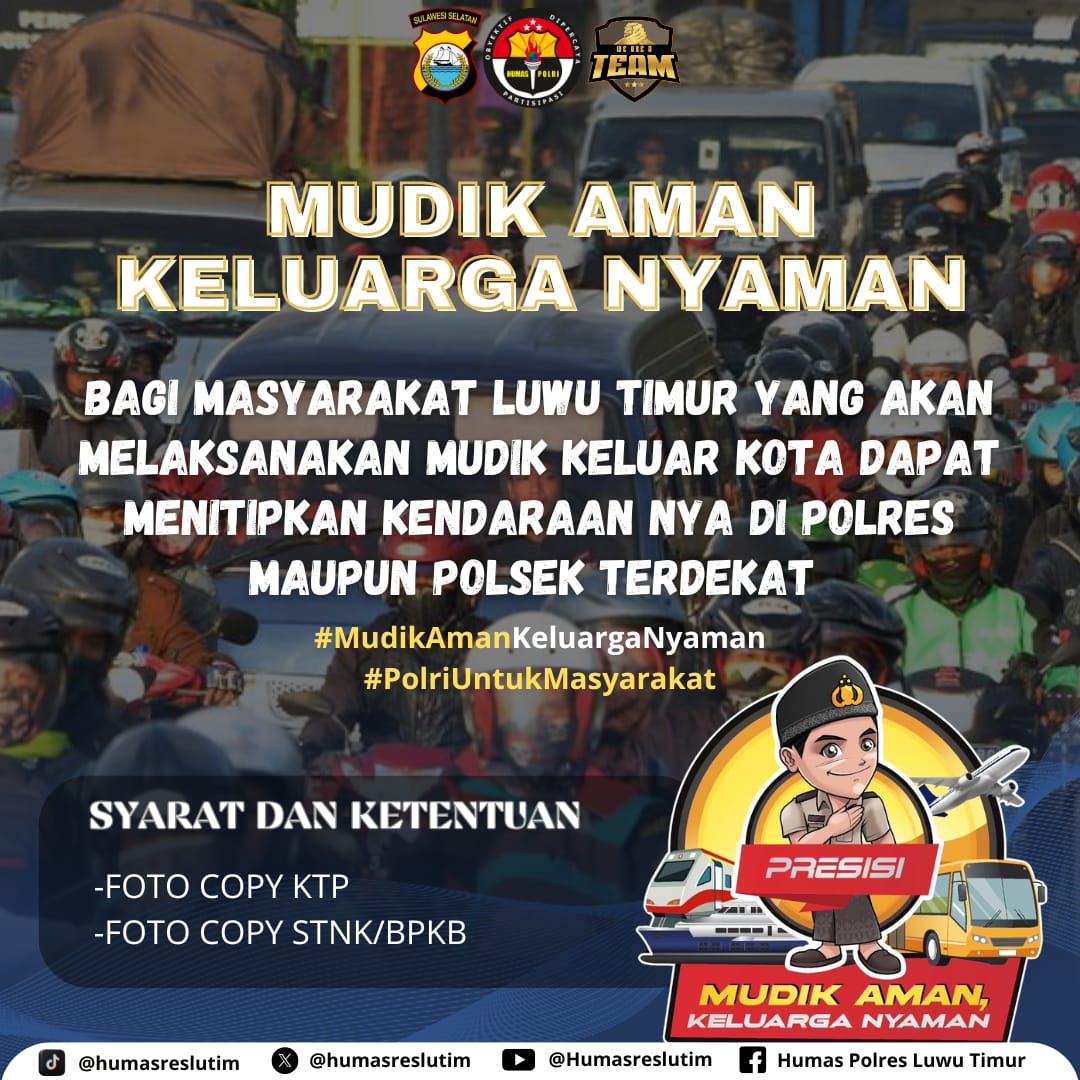 Kapolres Luwu Timur, AKBP Zulkarnain, S.H.,S.I.K.,MH mengimbau masyarakat untuk tidak ragu menitipkan kendaraannya di Polres atau Polsek selama mudik Lebaran. Ia menegaskan bahwa layanan penitipan ini tidak dipungut biaya alias gratis.