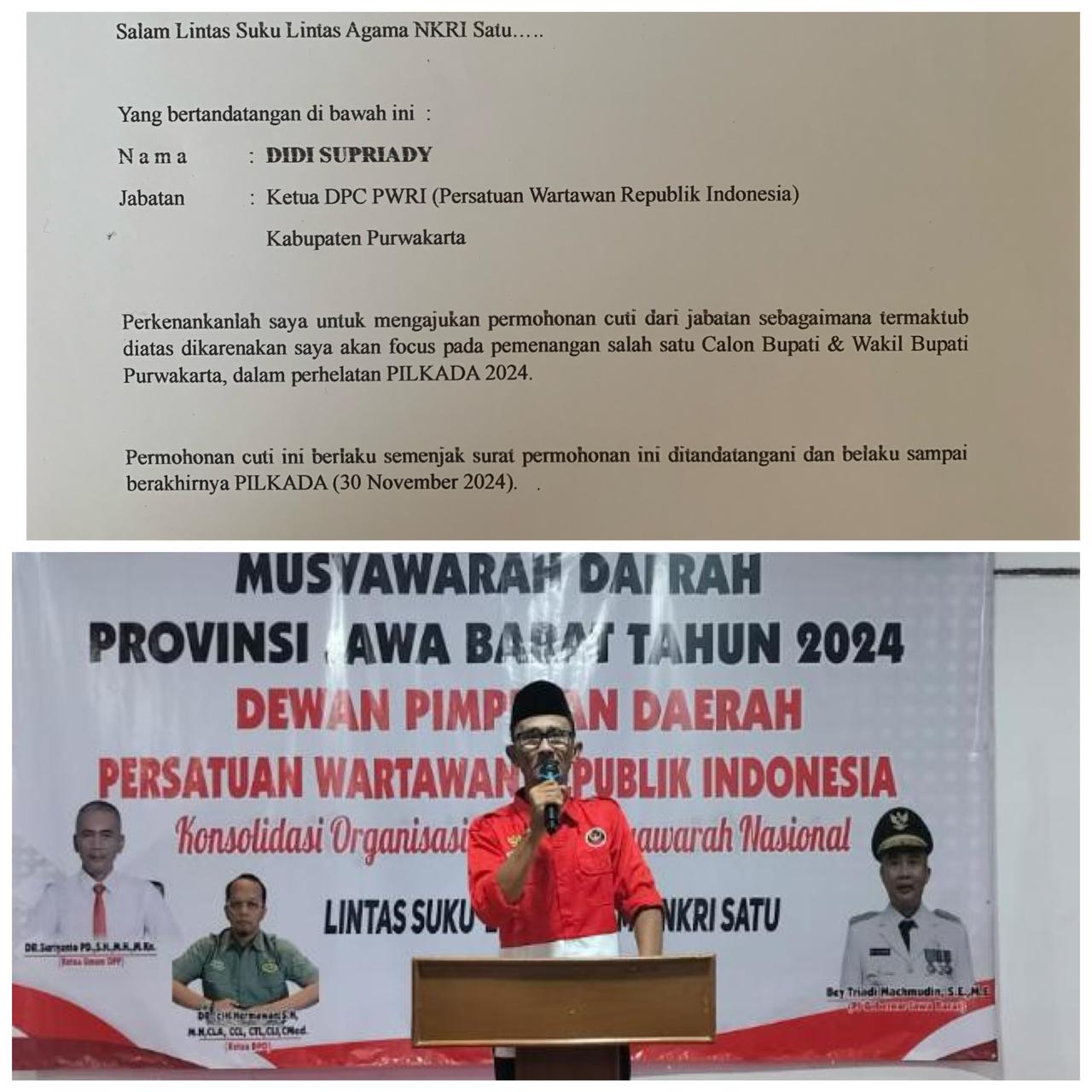 Didi Supriady, Ketua Dewan Pengurus Cabang (DPC) Persatuan Wartawan Republik Indonesia (PWRI) Kabupaten Purwakarta secara resmi mengambil cuti hingga selesainya Pemilihan Kepala Daerah (Pilkada) 2024. Keputusan ini diambil sebagai bentuk komitmen untuk menjaga netralitas dan integritas organisasi selama proses pemilihan berlangsung.