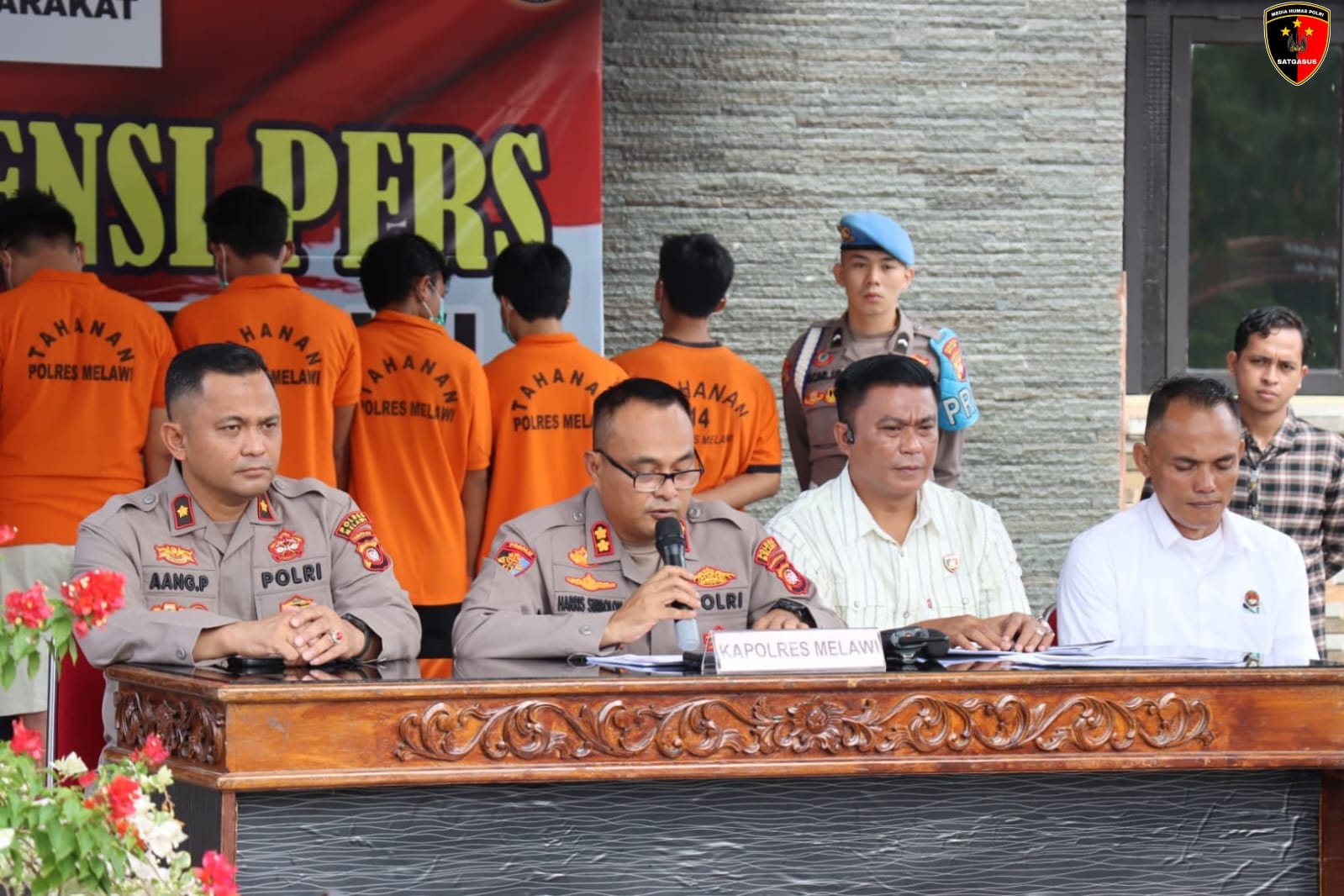 Konferensi Pers Polres Melawi di pimpin langsung Kapolres Melawi Polda Kalbar AKBP Harris Batara Simbolon, S.I.K., S.H., M.Tr.Opsla di damping Waka Polres Kompol Aang Permana, S.I.P., S.H., M.A.P, Kasat Reskrim Ambril, S.H., M.A.P., Kasat Narkoba AKP Dhanie Sukmo Widodo di Polres Melawi, Selasa (27/5/25).