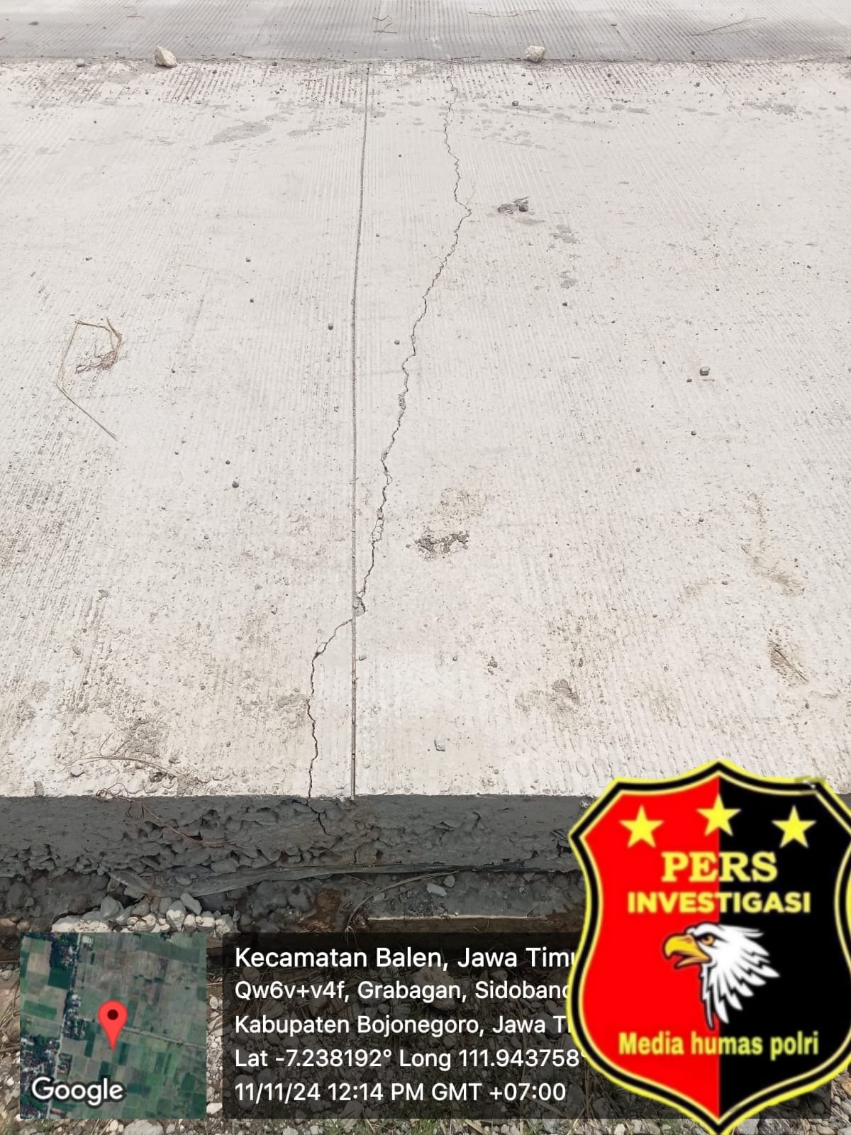 Menurut faktualisasi di lapangan, proyek pembangunan jalan jenis rigid beton yang baru saja rampung dikerjakan oleh CV. SETYA KARYA asal Desa Mayangkawis RT. 19 RW. 02, Kecamatan Balen tersebut, kini kondisinya sudah mengalami keretakan dibeberapa titik lapisan atas (concrete slab) rigid beton