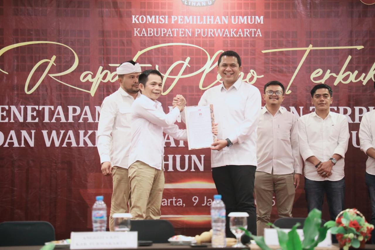 Komisi Pemilihan Umum (KPU) Kabupaten Purwakarta menetapkan calon bupati dan wakil bupati terpilih hasil Pilkada 2024. Penetapan tersebut dilakukan melalui rapat pleno terbuka di Prime Plaza Hotel Kabupaten Purwakarta, Kamis, 9 Januari 2025.