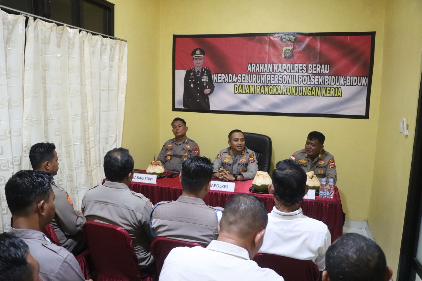 Kunjungan diawali dengan penyampaian ucapan terima kasih Kapolres Berau kepada jajaran Polsek Tabalar atas upaya menjaga kamtibmas tetap aman dan kondusif. Ia juga menjelaskan tujuan kedatangannya untuk mengecek kesiapan personel sekaligus kondisi mako Polsek. “Polsek adalah garda terdepan dalam melayani masyarakat. Kehadiran bhabinkamtibmas harus selalu ada di tengah masyarakat,” ujar AKBP Ridho.