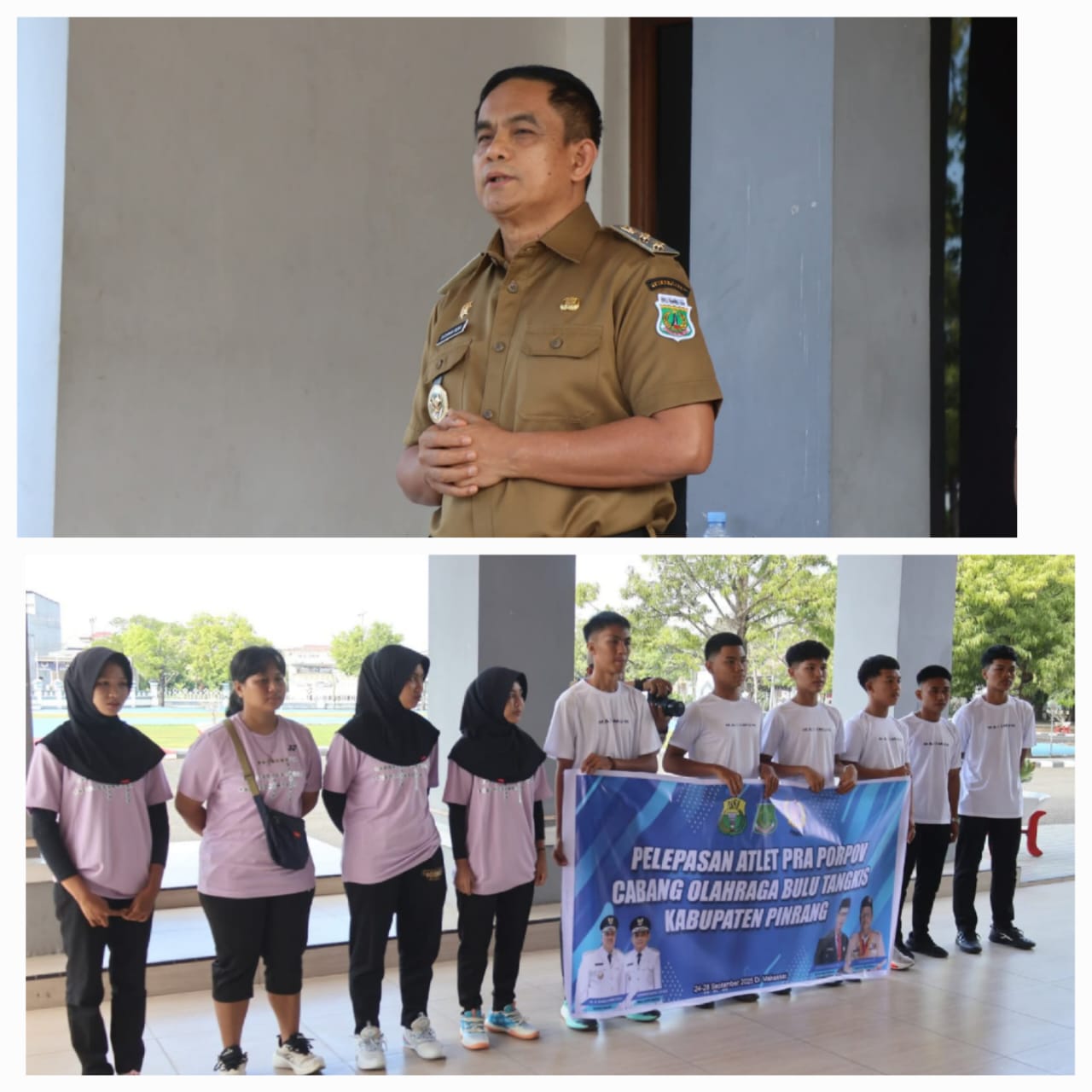 Wakil Bupati Pinrang, Sudirman Bungi, S.IP., M.Si., melepas kontingen bulu tangkis yang akan berlaga di ajang, Pra Pekan Olahraga Provinsi (Porprov) Sulawesi selatan, Selasa (23/9/2025).