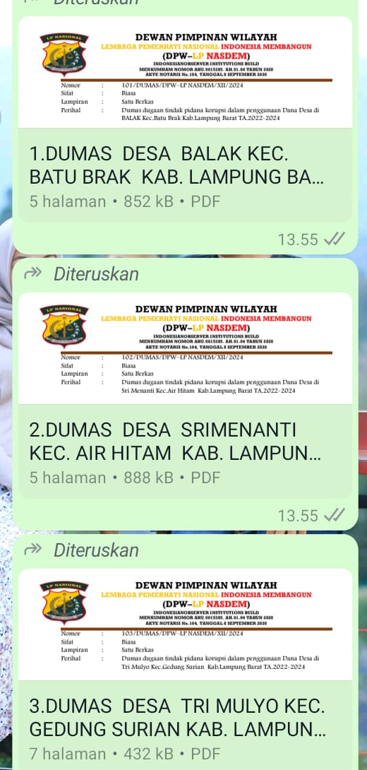 Informasi di laporkan nya dua tiga Kepala Desa yang ada di kabupaten Lampung barat tersebut di benarkan oleh ASEP ZAKARIA.cMH selaku Dewan Pimpinan Nasional (DPN) Bagian Penindakan dan Pelaporan LP NASDEM dan kuasa hukum nya