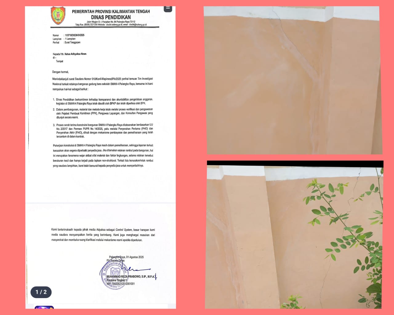Menyikapi surat balasan dari Dinas Pendidikan Provinsi Kalimantan Tengah terkait temuan tim Investigasi Adhyaksa News adanya keretakan berulang Kali pada bangunan baru SMA Negeri 4 Palangka Raya di Jalan Sisingamangaraja III, Menteng, Pahandut, Rabut selaku Ketua Umum Laskar Anti Korupsi Indonesia (LAKI), menyampaikan apresiasi sekaligus menegaskan kembali pentingnya transparansi publik dalam pengelolaan Anggaran Pembangunan Sarana Pendidikan.