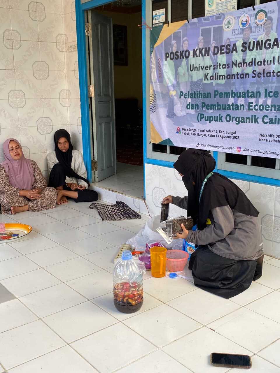 Kegiatan ini mendapat sambutan hangat dari warga, mulai dari ibu-ibu rumah tangga, pemuda, hingga bapak-bapak desa. Peserta diajarkan langsung cara membuat es krim dari buah lokal seperti jeruk, mangga, pisang, dan jambu. Mereka juga belajar memproduksi *eco enzyme*, cairan hasil fermentasi limbah organik yang bisa digunakan sebagai pupuk cair, pengusir hama, hingga pembersih alami.