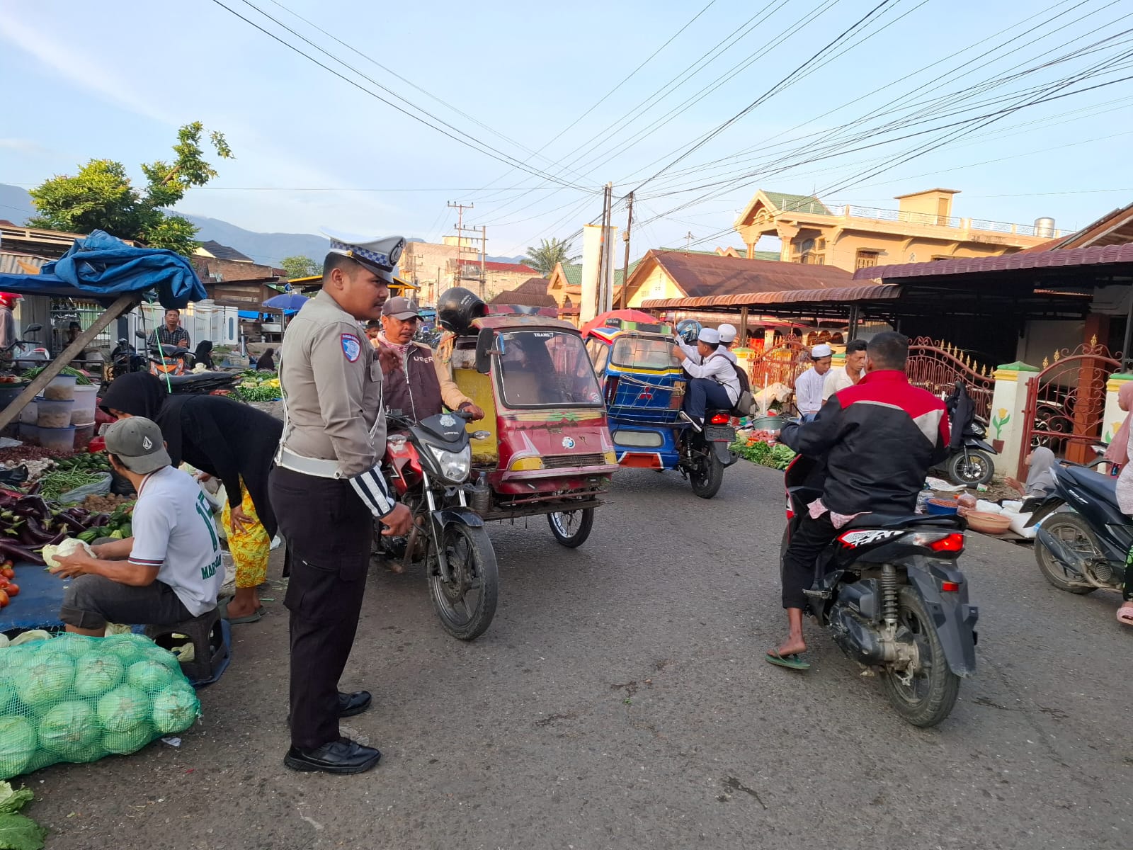 Personil Satuan Lalu Lintas Polres Padang laksanakan kegiatan pengaturan arus lalu lintas padat pagi demi terciptanya Kamseltibcarlantas Kota Sibuhuan Kabupaten Padang Lawas, (17/02/2025).