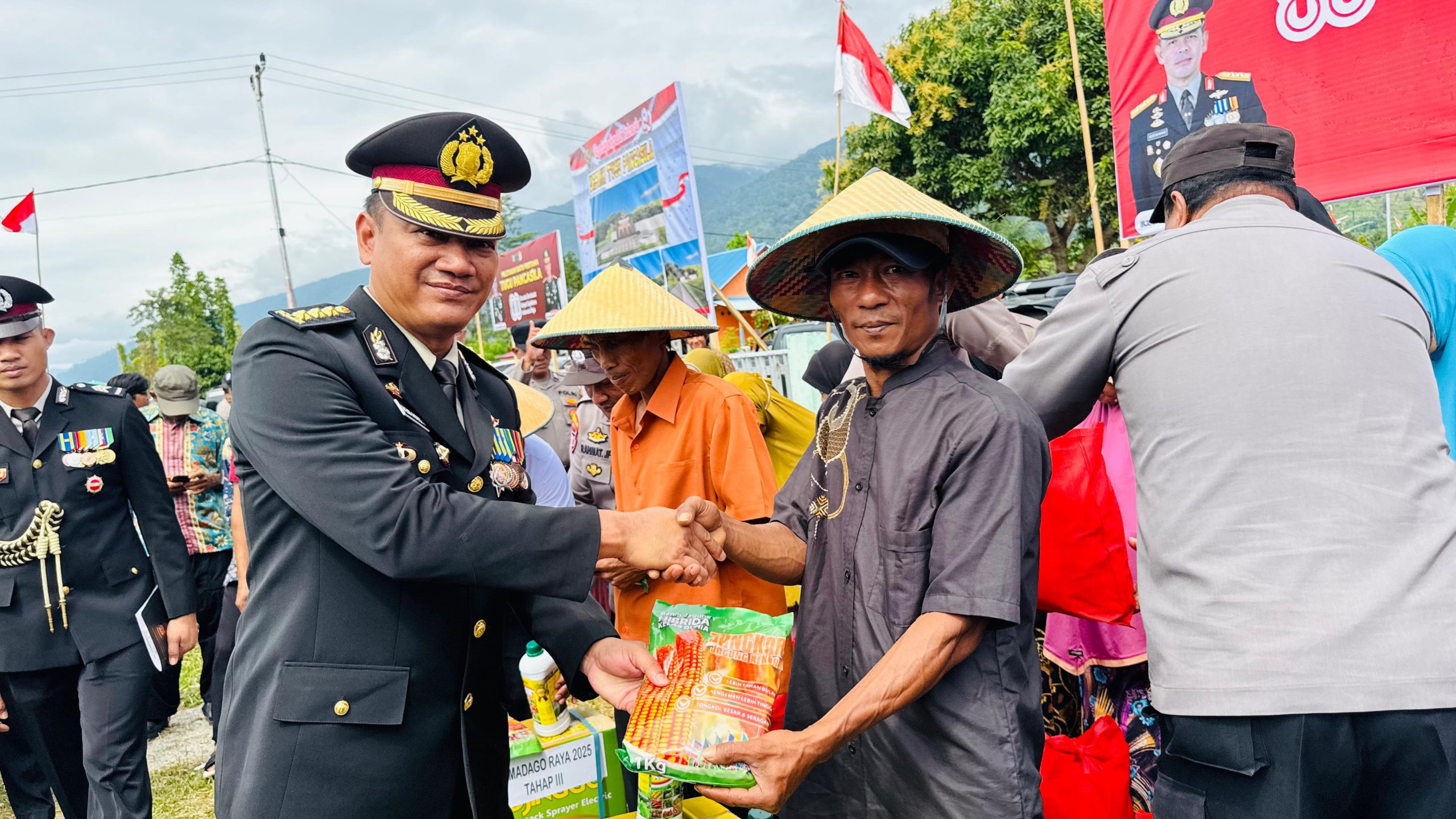 Dalam bakti sosial pertanian, Kapolda Sulteng menyerahkan langsung bantuan kepada tiga perwakilan kelompok tani. Bantuan yang diberikan berupa 30 kilogram benih jagung, tiga dos pupuk, serta lima buah alat semprot. Bantuan ini diharapkan dapat meningkatkan produktivitas pertanian masyarakat.