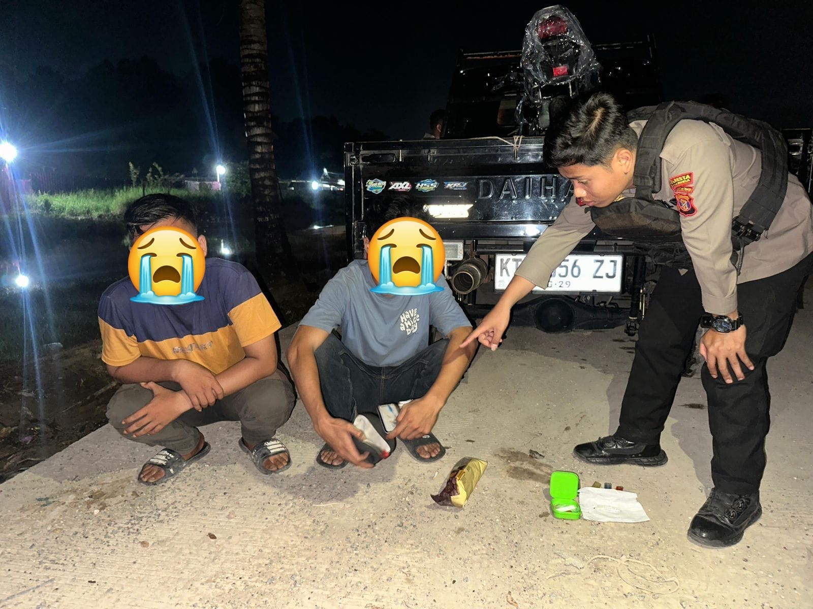 Tim Patroli Gabungan Regu 1—terdiri dari Beat 8, 9, dan 10 Sat Samapta melaksanakan penyisiran di Jalan Stadion Palaran. Petugas mendapati satu unit mobil Grand Max KT 8056 ZJ berhenti di lokasi sepi. Saat dilakukan pemeriksaan, dua orang di dalam kendaraan tersebut menunjukkan gelagat tidak kooperatif sehingga meningkatkan kecurigaan anggota.