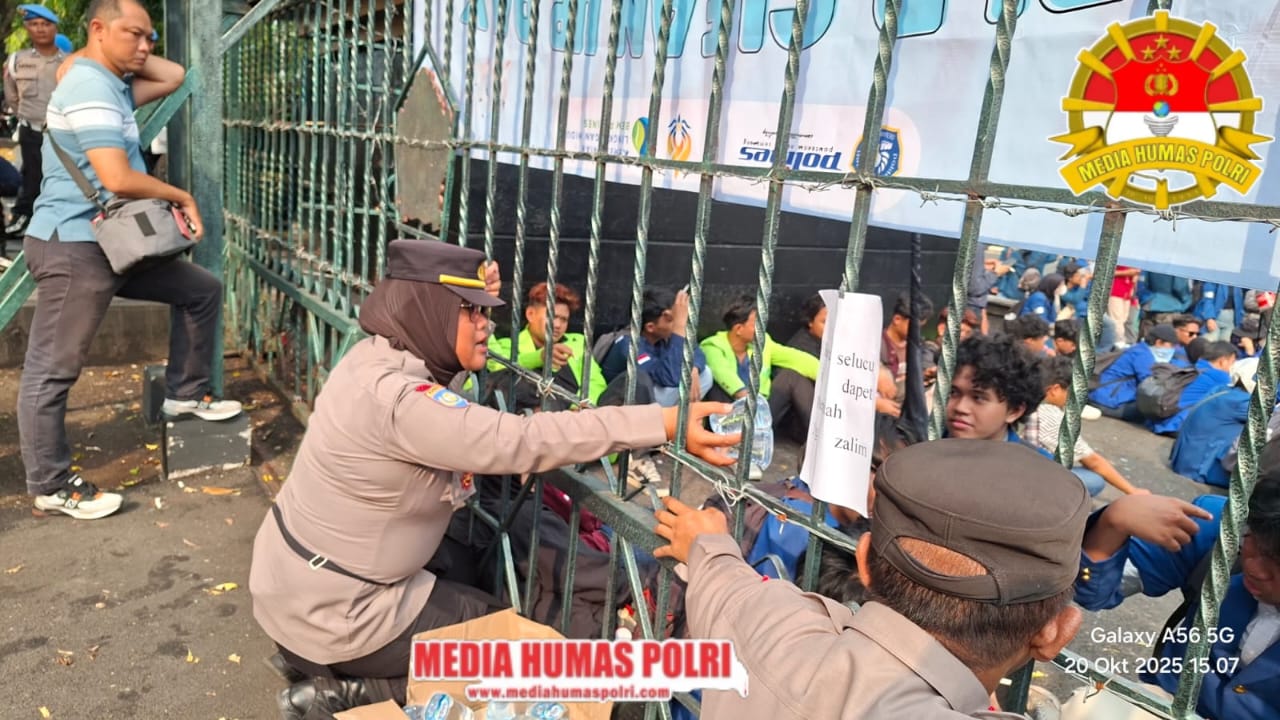 Momen humanis juga tampak ketika Polwan negosiator berinteraksi hangat dengan beberapa pengunjuk rasa dari balik pintu gerbang. Di tengah cuaca yang terik, petugas bahkan membagikan air mineral kepada para pengunjuk rasa agar tidak dehidrasi saat berorasi di bawah terik matahari.