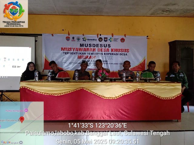 Berdasarkan instruksi presiden nomor 09 tahun 2025 tentang percepatan pembentukan koperasi merah putih serta surat edaran Mentri koperasi nomor 01 tahun 2025 tentang pembentukan koperasi desa merah putih dan Permendes nomor 03 tahun 2025 tentang pedoman umum pendampingan masyarakat desa. Untuk itu senin tanggal 05 Mei 2025, bertempat digedung BPU Desa paisulamo diadakan musyawarah desa khusus pembentukan pengurus koperasi merah putih Desa paisulamo kecamatan Labobo , kabupaten Banggai Laut.