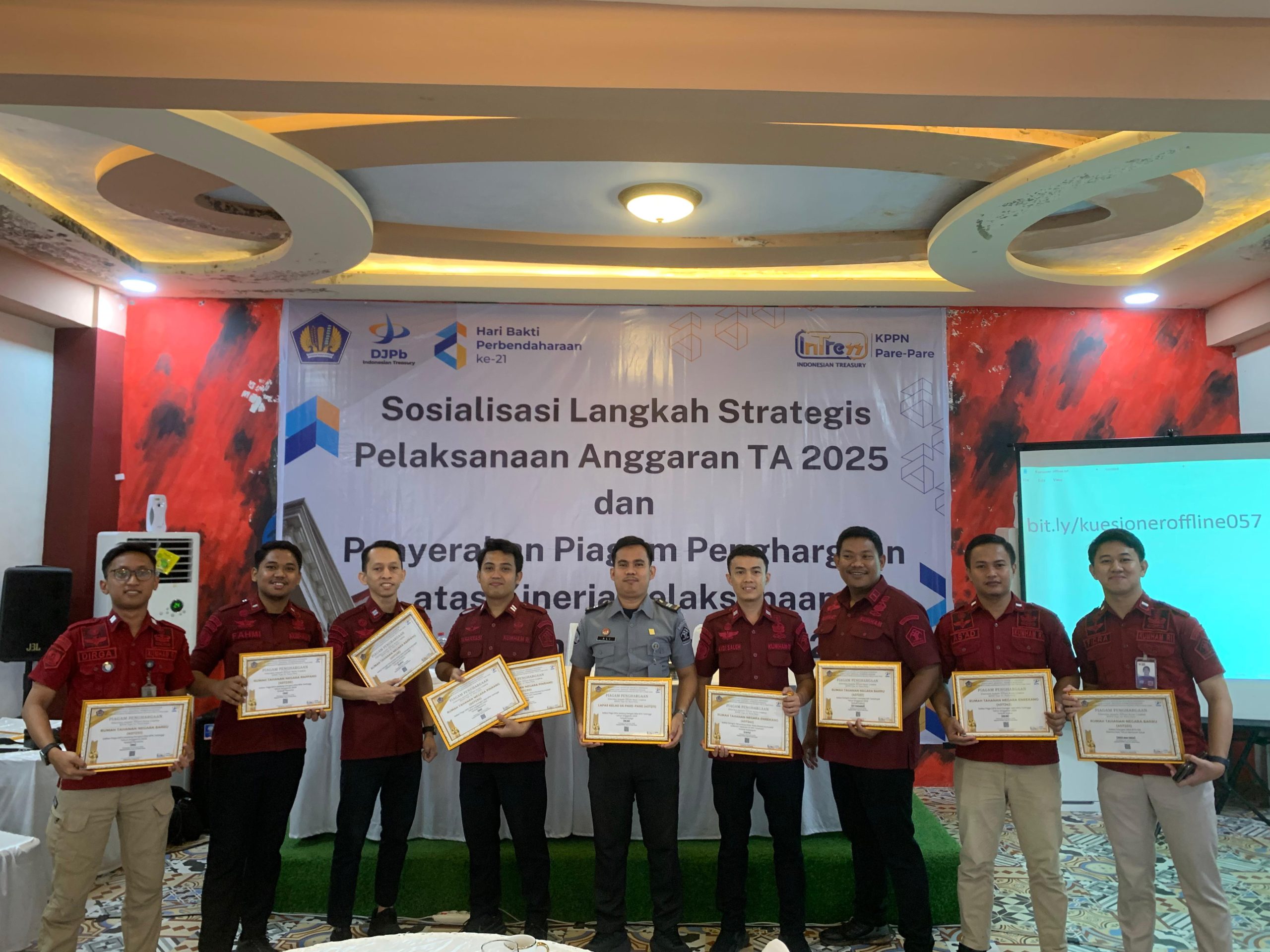 Rumah Tahanan Negara (Rutan) Kelas IIB Pinrang, menerima penghargaan sebagai Satuan Kerja dengan Indeks Kinerja Pelaksanaan Anggaran (IKPA) Terbaik Pertama kategori Pagu DIPA Sedang semester kedua Tahun Anggaran 2024 dari Kantor Pelayanan Perbendaharaan Negara (KPPN) Tipe A1 Parepare, Kamis (23/1/2025).