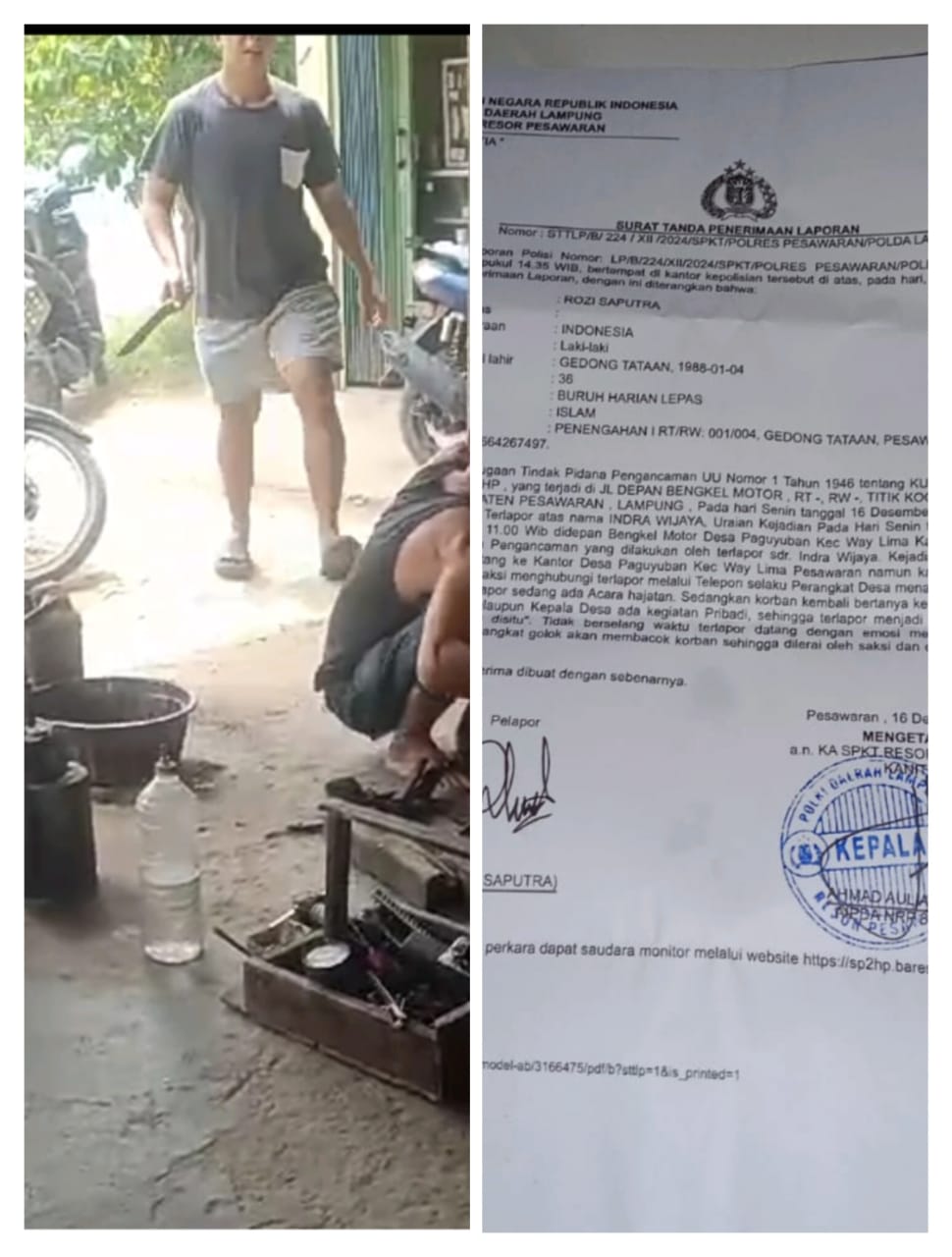 Aksi brutal pengancaman dengan kekerasan mengunakan senjata tajam (golok), Terhadap wartawan media kompas.86 (RS) oleh pelaku (IW) oknum aparatur desa paguyuban kecamatan way lima kabupaten pesawaran. 18/12/2024.