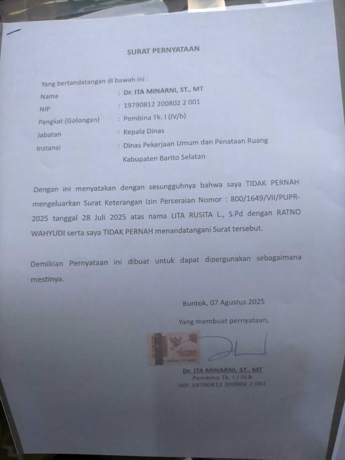 Dalam hal ini Kadis PUPR Barito Selatan,disitu masalah muncul,dua dokumen Surat yang isinya berbeda,satu Surat isinya memberikan izin cerai kepada Ny LN,sedang Surat kedua isinya Kadis PUPR secara jelas menerangkan tidak pernah memberikan rekomendasi izin perceraian kepada bawahannya bernama Ny LN.