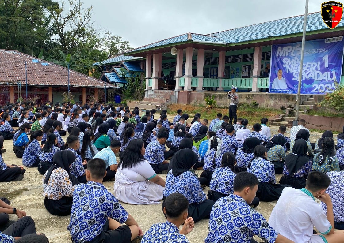 Satuan Lalu Lintas (Satlantas) Polres Sekadau memberikan edukasi keselamatan dan tertib berlalu lintas kepada pelajar melalui program Police Goes To School dalam rangkaian Operasi Patuh Kapuas 2025, Rabu (16/7).