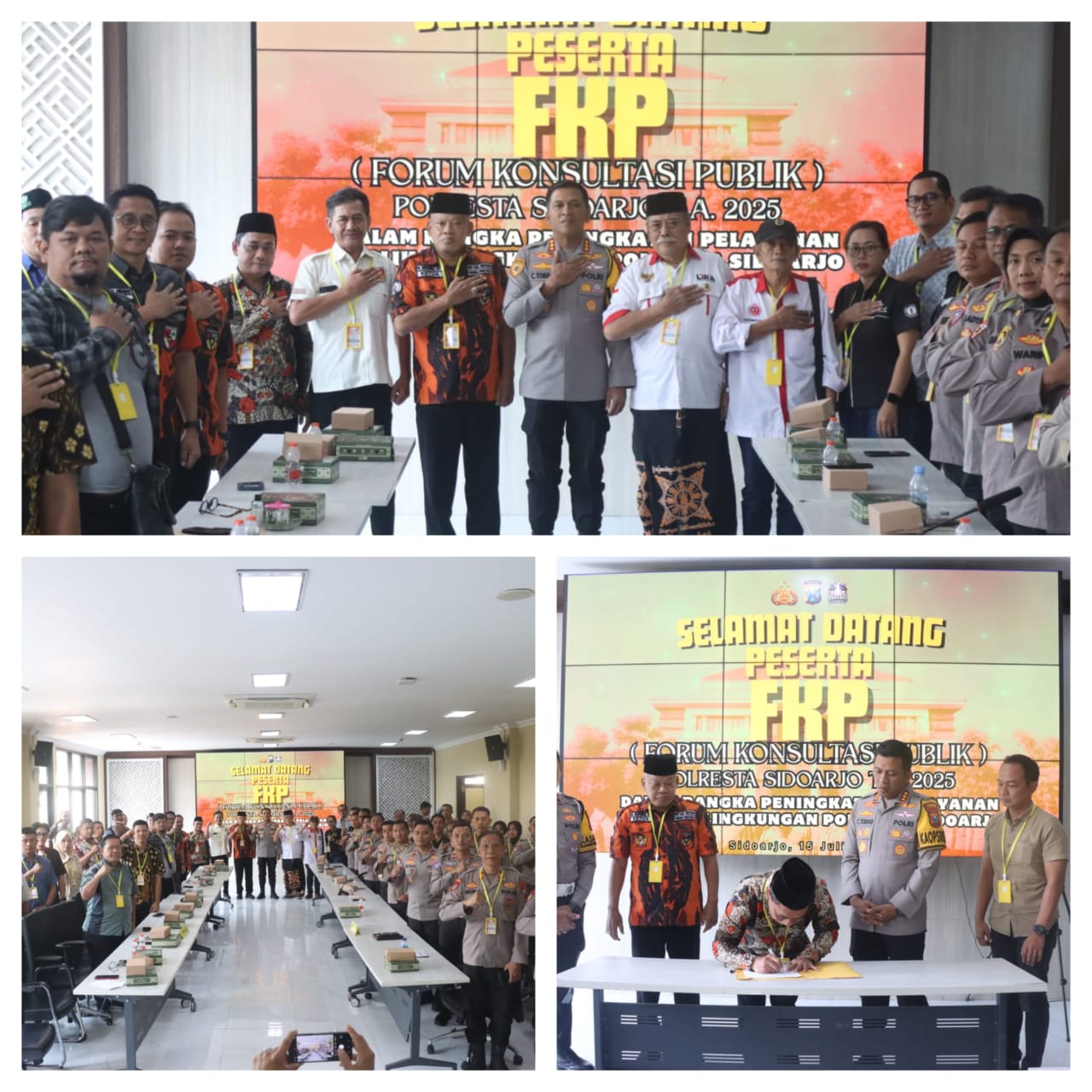 Polresta Sidoarjo menggelar forum konsultasi publik dengan melibatkan sejumlah elemen masyarakat, mahasiswa, jurnalis dan komunitas, Selasa (15/7/2025). Tujuan dari kegiatan itu yakni sebagai langkah optimalisasi layanan publik di ruang lingkup Polresta Sidoarjo.