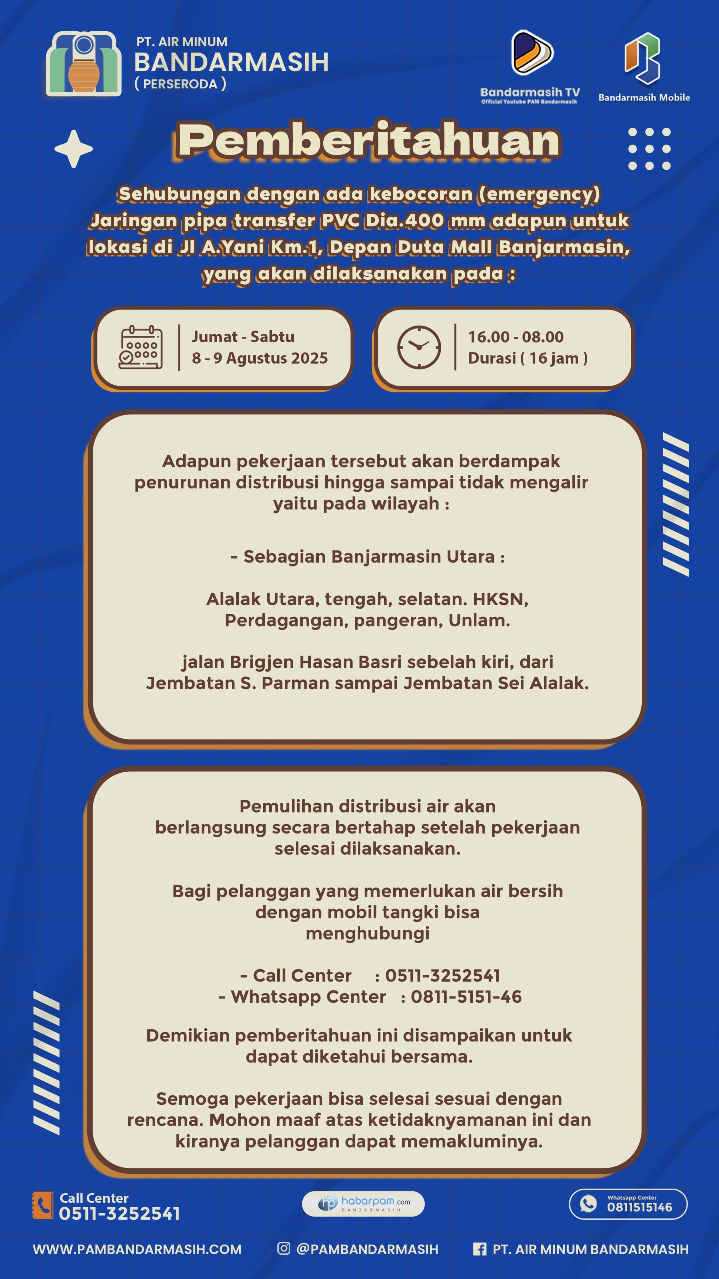 Supervisor Humas PT Air Minum Bandarmasih, Murjani mengatakan, untuk perbaikan kebocoran mulai Jumat (9/8/2025) hingga Sabtu (10/8/2025).