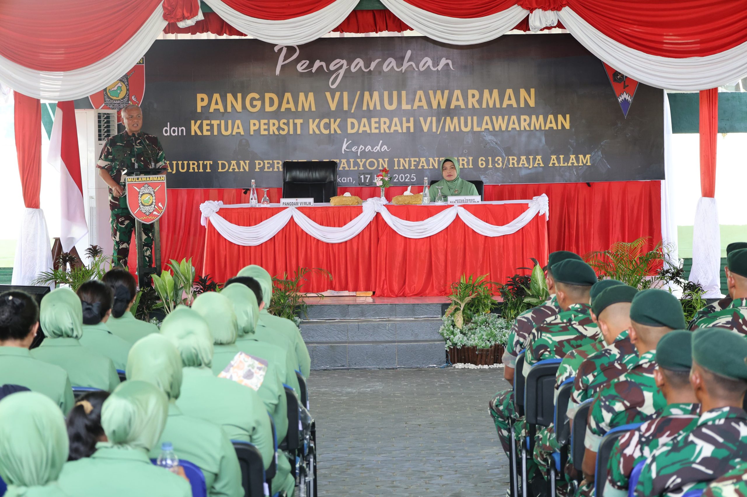 Panglima Komando Daerah Militer (Pangdam) VI/Mulawarman, Mayjen TNI Rudi Rachmat Nugraha, S.I.P., M.Sc., memberikan pengarahan sekaligus motivasi kepada prajurit dan keluarga besar Batalyon Infanteri 613/Raja Alam dalam kunjungan kerjanya ke wilayah Provinsi Kalimantan Utara. Kegiatan ini berlangsung di Markas Yonif 613/Rja, Kota Tarakan, pada Selasa (17/6/2025).