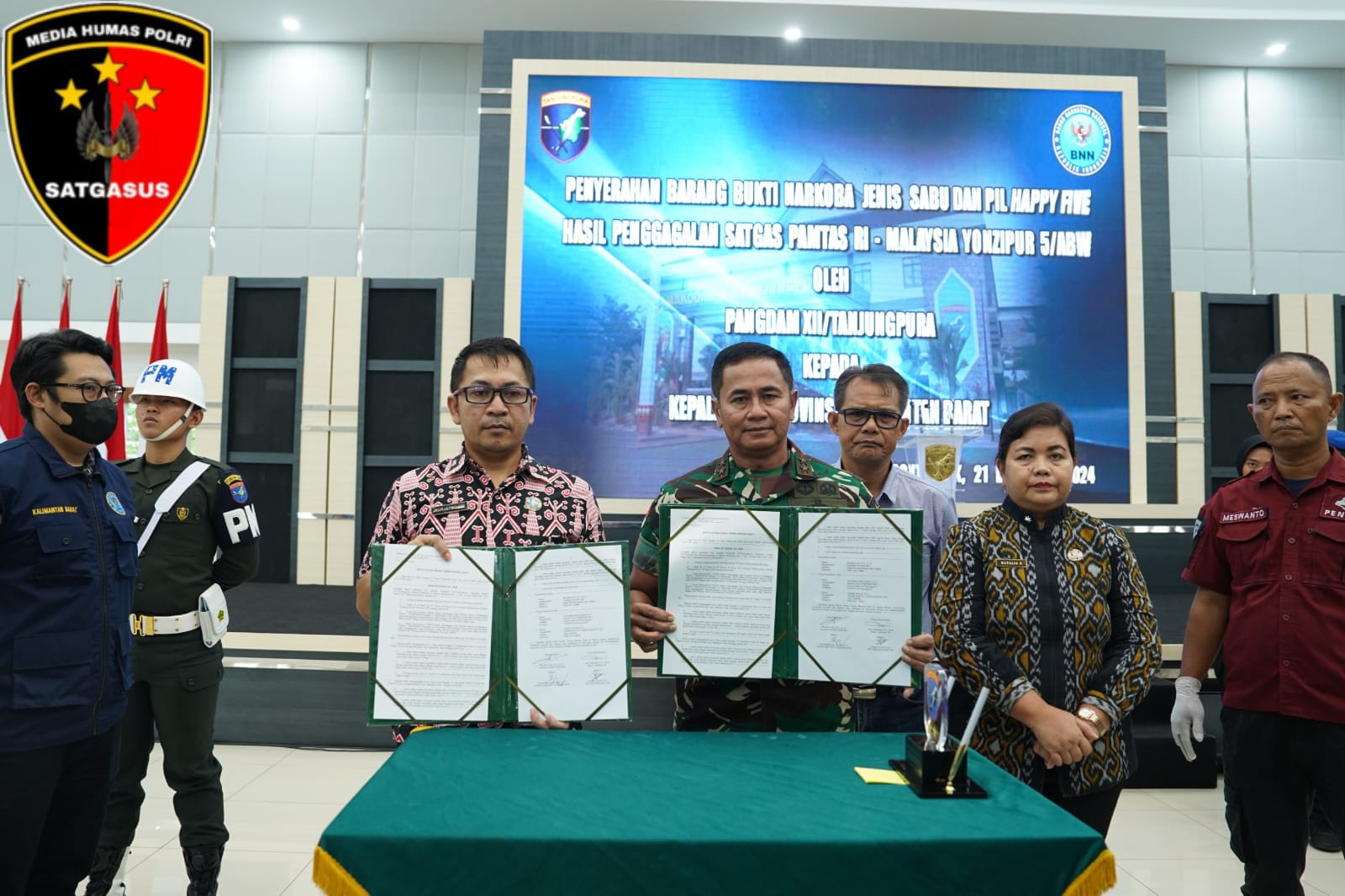 Adapun barang bukti Narkoba yang diserahkan berupa sabu 6.206,4 Gram dan Pil Happy Five sebanyak 70 strip (700) butir. Narkoba tersebut merupakan hasil penggagalan dari Satgas Pamtas RI-Malaysia Batalyon Zipur 5/ABW di wilayah perbatasan.