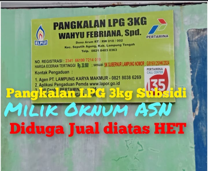 Sangat disayangkan adanya penyalahgunaan Wewenang , Yang berpotensi merugikan Masyarakat kecil , dengan Menjual LPG 3kg Subsidi diatas HET yang telah di tentukan aturan dan undang undang sama hal nya merampas Subsidi Untuk Masyarakat kecil , , seperti yang terjadi di Pangkalan , WAHYU FEBRIANA Spd ,Yang beralamat di Dono Arum RT 018 RW 002 Kecamatan Seputih Agung Kabupaten Lampung Tengah