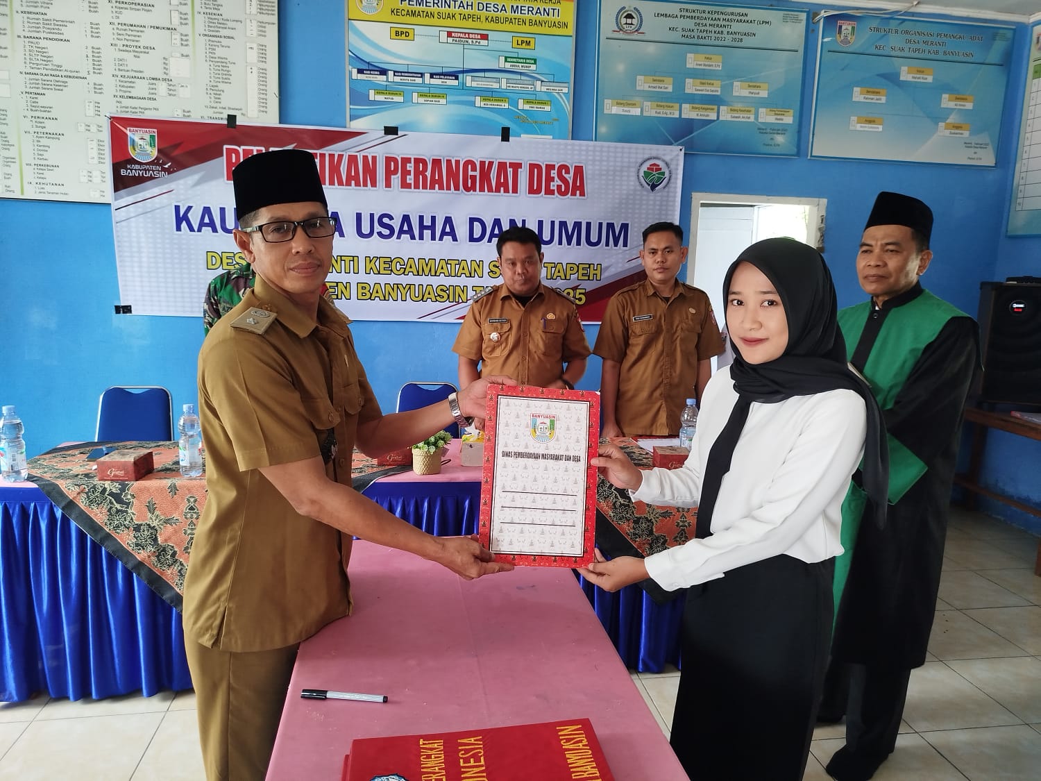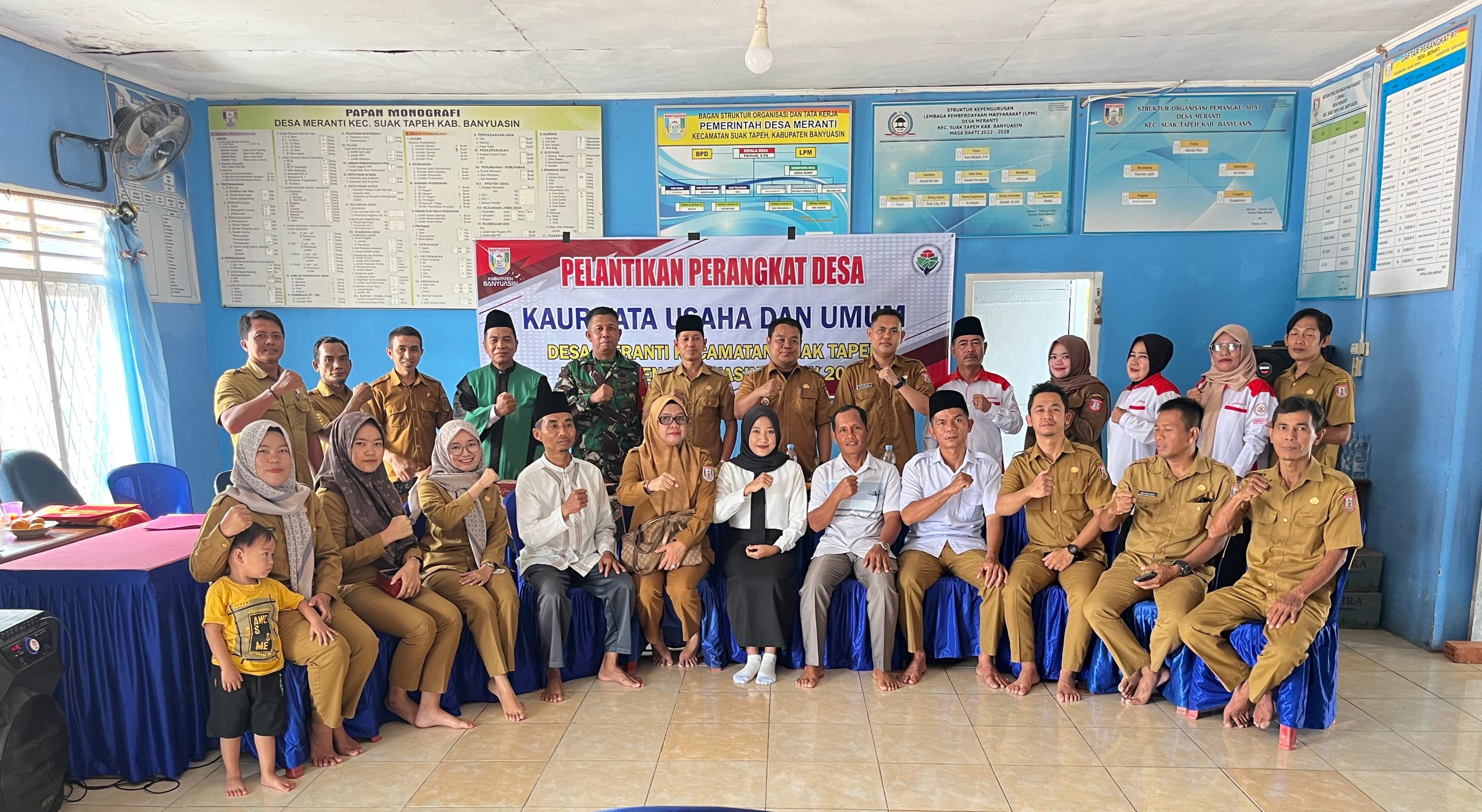 Pemerintah Desa Meranti Kecamatan Suak Tapeh , Kabupaten Banyuasin Propinsi Sumatera Selatan melaksanakan prosesi Pelantikan Perangkat Desa dalam Jabatan Kaur Tata Usaha (TU)yang dilangsungkan pada Selasa 7 oktober 2025 di Kantor Desa Meranti