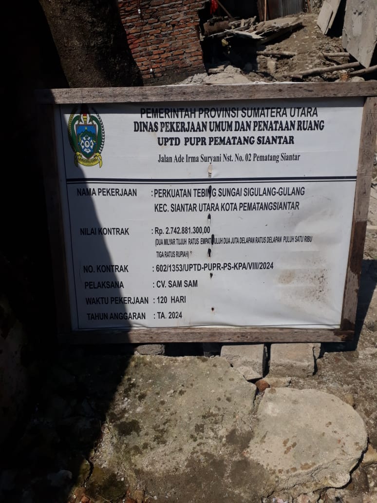Pembangunan tembok penahan, Pagu 2,7 Milyar Tumbang Ambruk Baru siap dikerjakan terletak Wilayah Sungai Sigulanggulang Kecamatan Siantar Kota Pematang Siantar Sumatra Utara, Sehingga Merugikan Uang negara mencapai milliaran Rupiah. proyek tersebut berasal dari Pekerjaan Umum TK 1 Sumatera Utara Tahun 2024.