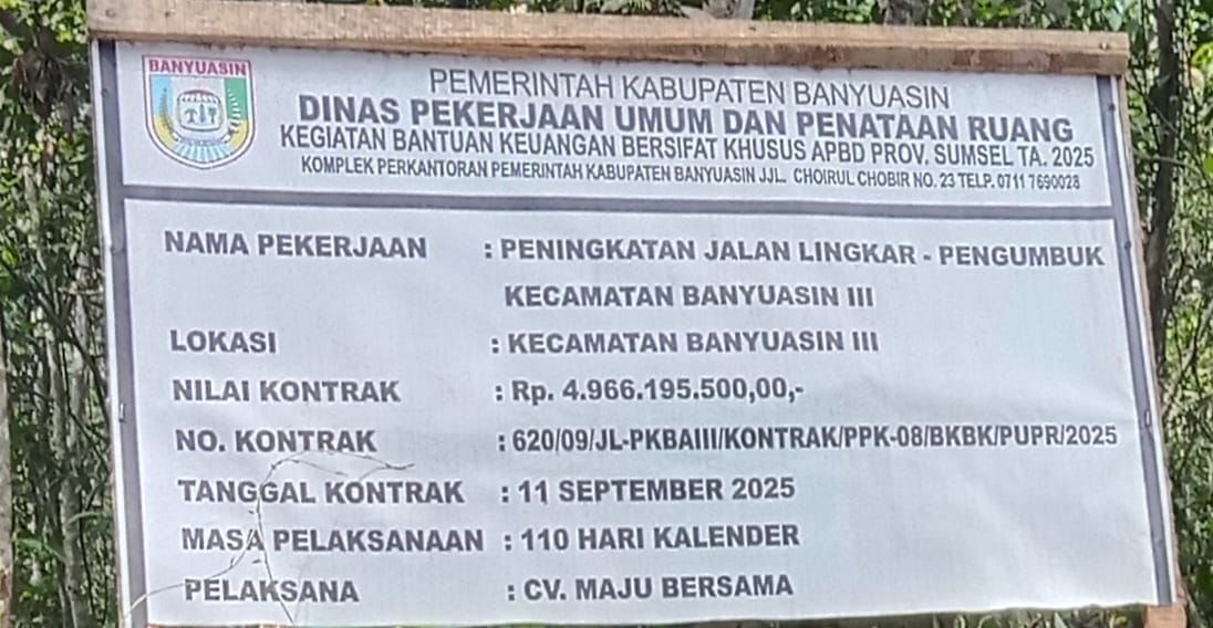 Lsm FP2KP menyoroti adanya dugaan penyimpangan dalam pekerjaan pembangunan proyek jalan lingkar Pengumbuk, tepatnya di perbatasan desa Tanjung Beringin, menuju ke desa Petaling kecamatan Banyuasin lll, kabupaten Banyuasin Sumatera Selatan.