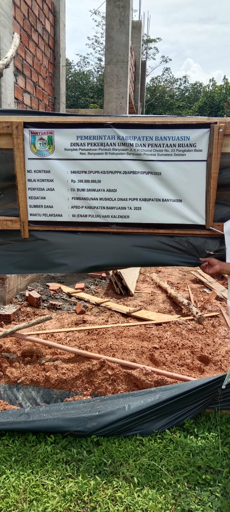 CV. Bumi Sriwijaya Abadi sebagai Pelaksana pekerjaan proyek bangunan Musolah dinas PUTR Kabupaten Banyuasin propinsi Sumatera Selatan, berdasarkan pantauan dilapangan pada rabu 5/10/2025