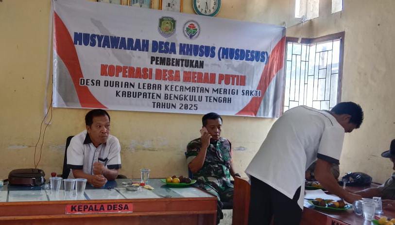 Pemerintah Desa (Pemdes) Durian Lebar Kecamatan Merigi Sakti Kabupaten Bengkulu Tengah, senin 26 Mei 2025 baru saja selesai Melaksanakan musyawarah Desa khusus (Musdesus) pembentukan koperasi merah putih. Rapat Pendirian Koperasi Desa Merah Putih Desa Durian Lebar di buka langsung oleh Kepala desa Durian Lebar Mulyadi, rapat ini Diikuti oleh Kepala Desa Beserta Perangkatnya serta turut hadir Perwakilan dari Polsek, Danramil, Babinkamtibnas serta para pendamping Desa.