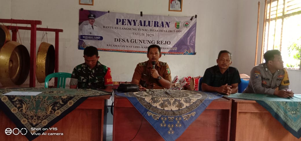 Lampung Pemerintah Desa Gunung Rejo kecamatan Way Lima kabupaten Pesawaran bagaikan Bantuan Langsung Tunai Dana Desa BLT- (DD) Bulan Januari s/d Maret 2025, selain pembagian BLT dd, Pemdes Gunung Rejo juga bagikan insentif insentif, guru paud, guru ngaji, linmas,marbot masjid, penjaga makam, RT/RW dan perangkat desa. Kegiatan tersebut bertempat di Balai Aula kantor Desa Gunung Rejo, senin 24 Maret 2025.