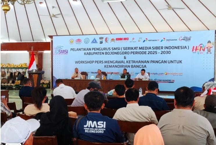 Dalam rangka memperingati Hari Pers Nasional (HPN) 2025, Pemkab Bojonegoro bersama Serikat Media Siber Indonesia (SMSI) Bojonegoro menggelar workshop di pendopo Malowopati, Kamis (27/2/2025). SMSI siap berkolaborasi menyukseskan program pemerintah, khususnya dalam mengawal ketahanan pangan untuk kemandirian bangsa.