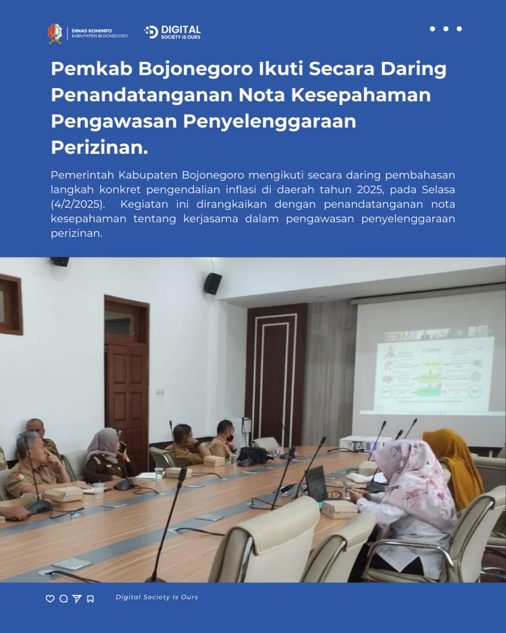 Pemerintah Kabupaten Bojonegoro mengikuti secara daring pembahasan langkah konkret pengendalian inflasi di daerah tahun 2025, pada Selasa (4/2/2025). Kegiatan ini dirangkaikan dengan penandatanganan nota kesepahaman tentang kerjasama dalam pengawasan penyelenggaraan perizinan.