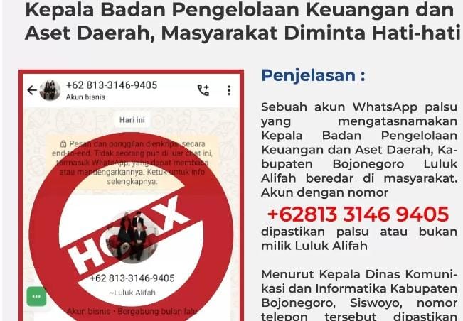 Pemkab Bojonegoro mengimbau warga untuk waspada atas beredarnya akun WhatsApp yang mengatasnamakan Kepala Badan Pengelolaan Keuangan dan Aset Daerah (BPKAD) Kabupaten Bojonegoro Luluk Alifah. Akun Whatsapp dengan nomor 0813-3146-9405 bermodus penipuan dan dipastikan tidak benar.