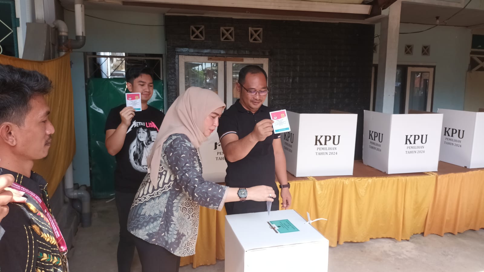 “Kami hari ini sekeluarga sudah menggunakan hak suara di TPS 026 Komplek Bumi Cahaya Bintang,” ujar Lisa kepada awak media usai mencoblos.