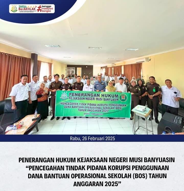 Penerangan Hukum Kejaksaan Negeri Musi Banyuasin dengan tema “Pencegahan Tindak Pidana Korupsi Penggunaan Dana Bantuan Operasional SEKOLAH (BOS) Tahun Anggaran 2025” Bertempat Pada SMK Negeri 3 Sekayu. Kegiatan ini dihadiri oleh, Bapak Abdul Harris Augusto, S.H.,M.H (Kepala Seksi Intelijen Kejaksaan Negeri Musi Banyuasin) bersama Haryanto, S.H (Kasubsi I Bidang Intelijen Kejari Muba), Lehavre Abeto Hutasuhut, S.H.,M.H. (Kasubsi II Bidang Intelijen Kejari Muba), Renny Ertalina,S.H. (Jaksa Fungsional Bidang Intelijen Kejari Muba), Stepany Imelda Sitorus,S.H. (Jaksa Fungsional Bidang Intelijen Kejari Muba) dan Staf Bidang Intelijen Kejaksaan Negeri Musi Banyuasin, Kepala Sekolah dan Bendahara Sekolah Menengah Atas Negeri, Sekolah Luar Biasa Negeri dan Sekolah Menengah Atas Swasta Kabupaten Musi Banyuasin