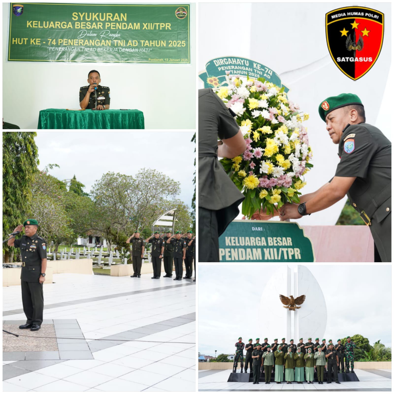 Keluarga besar Penerangan Kodam (Pendam) XII/Tanjungpura menggelar acara syukuran dalam rangka memperingati Hari Ulang Tahun (HUT) ke-74 Penerangan TNI Angkatan Darat. Bertempat di Media Center Kodam XII/Tpr, Jalan Teuku Umar, Kota Pontianak Senin (13/1/2025).