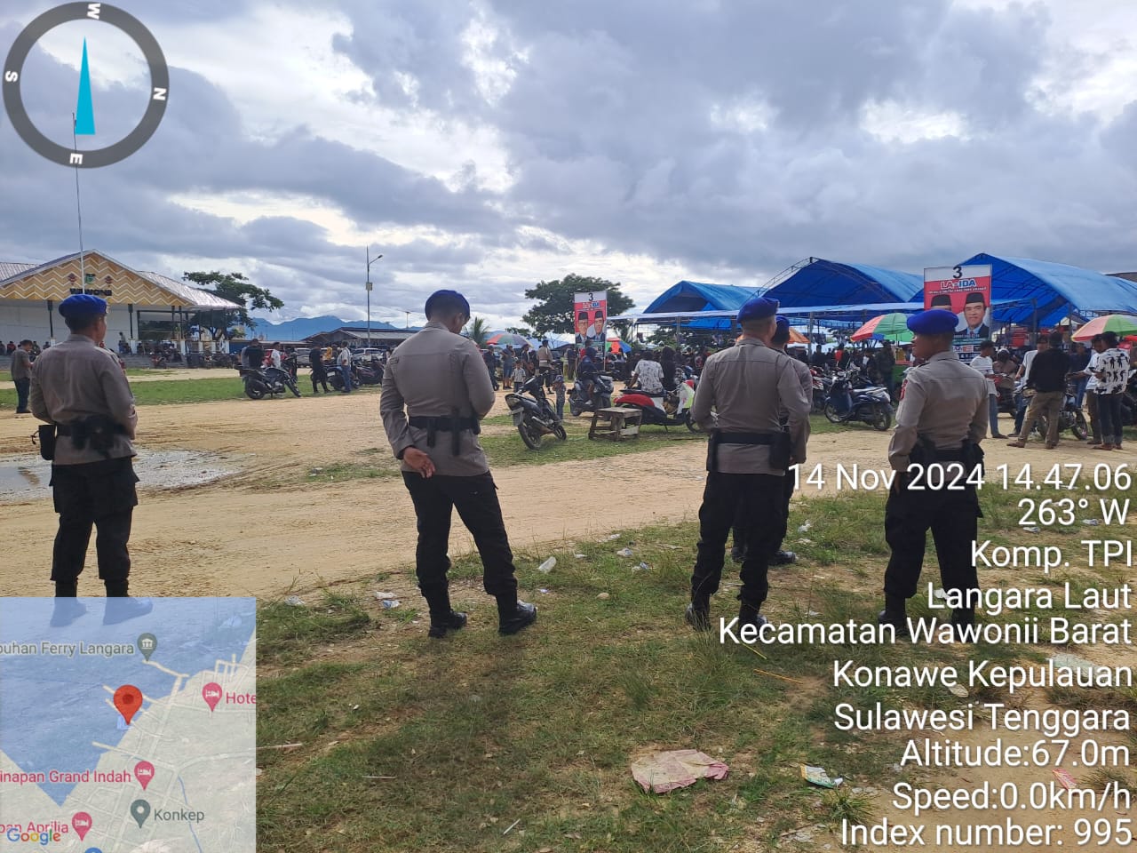 Personel dari Subsatgas Banops Ditpolairud Polda Sulawesi Tenggara melaksanakan pengamanan untuk kegiatan kampanye dialogis pasangan calon gubernur dan wakil gubernur Sultra, Lukman Abunawas – La Ode Ida. Acara kampanye yang diadakan di Lapangan TPI Langara Woweni, Konawe Kepulauan ini dihadiri masyarakat setempat yang ingin berpartisipasi dalam proses demokrasi secara aman dan damai.