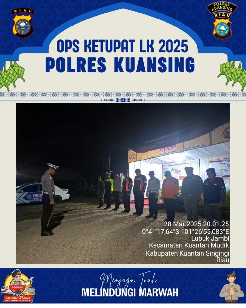 Kapolres Kuantan Singingi AKBP Angga F. Herlambang, S.I.K., S.H., melalui Kapolsek Kuantan Mudik AKP Hendra Setiawan, S.H., menyampaikan Pada Jumat, 28 Maret 2025, sekitar pukul 20.00 WIB, telah dilaksanakan Apel Malam Pengecekan Personil Pengamanan Pos PAM/Pos Yan Lebaran Desa Kasang. Apel ini dipimpin oleh IPDA Yocki Sumbari selaku Kepala Pos Pengamanan (Ka Pos PAM/Pos Yan) Desa Kasang.