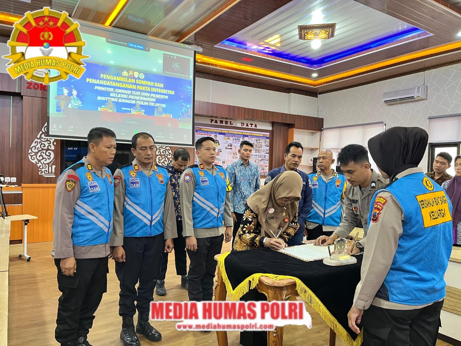 Polres Wonogiri menggelar kegiatan Pengambilan Sumpah dan Penandatanganan Pakta Integritas bagi peserta Penerimaan Bintara Brimob Polri Tahun Anggaran 2026 di Aula Sanika Satyawada, Kamis (20/11/2025). Agenda tersebut menjadi salah satu tahapan penting untuk memastikan proses rekrutmen berjalan objektif, transparan, dan bebas dari praktik penyimpangan.