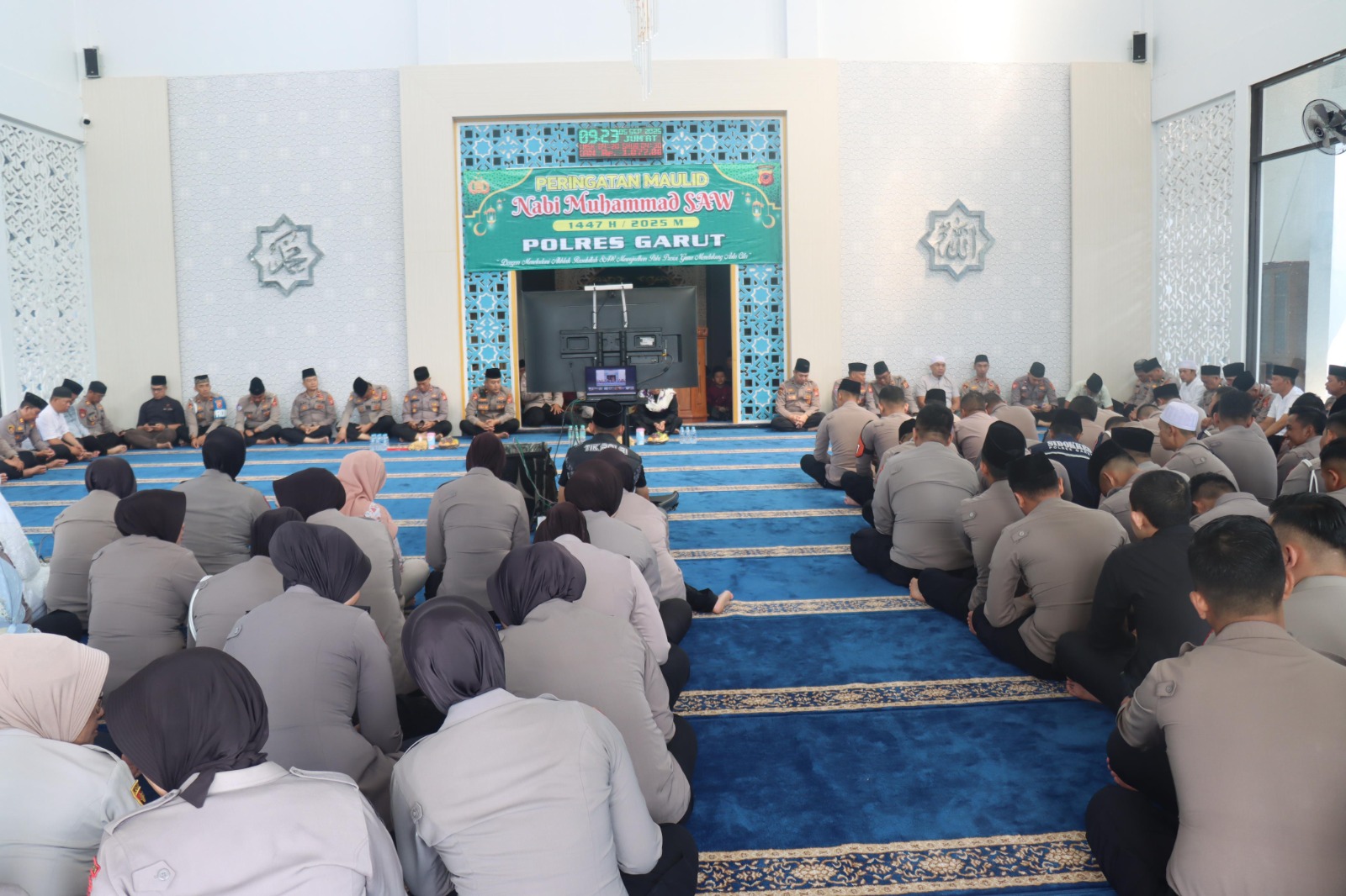 Polres Garut menyelenggarakan peringatan Maulid Nabi Muhammad SAW 1447 H sebagai bagian dari program pembinaan terpadu di lingkungan jajaran Polres Garut. Acara yang berlangsung di Masjid Nurul Hakim Mapolres Garut ini dihadiri oleh Kapolres Garut AKBP Yugi Bayu Hendarto beserta Ibu Ketua Bhayangkari Cabang Garut Ny. Intan Yugi, serta para pejabat utama, perwira, bintara, dan ASN. Jumat (5/9/2025).