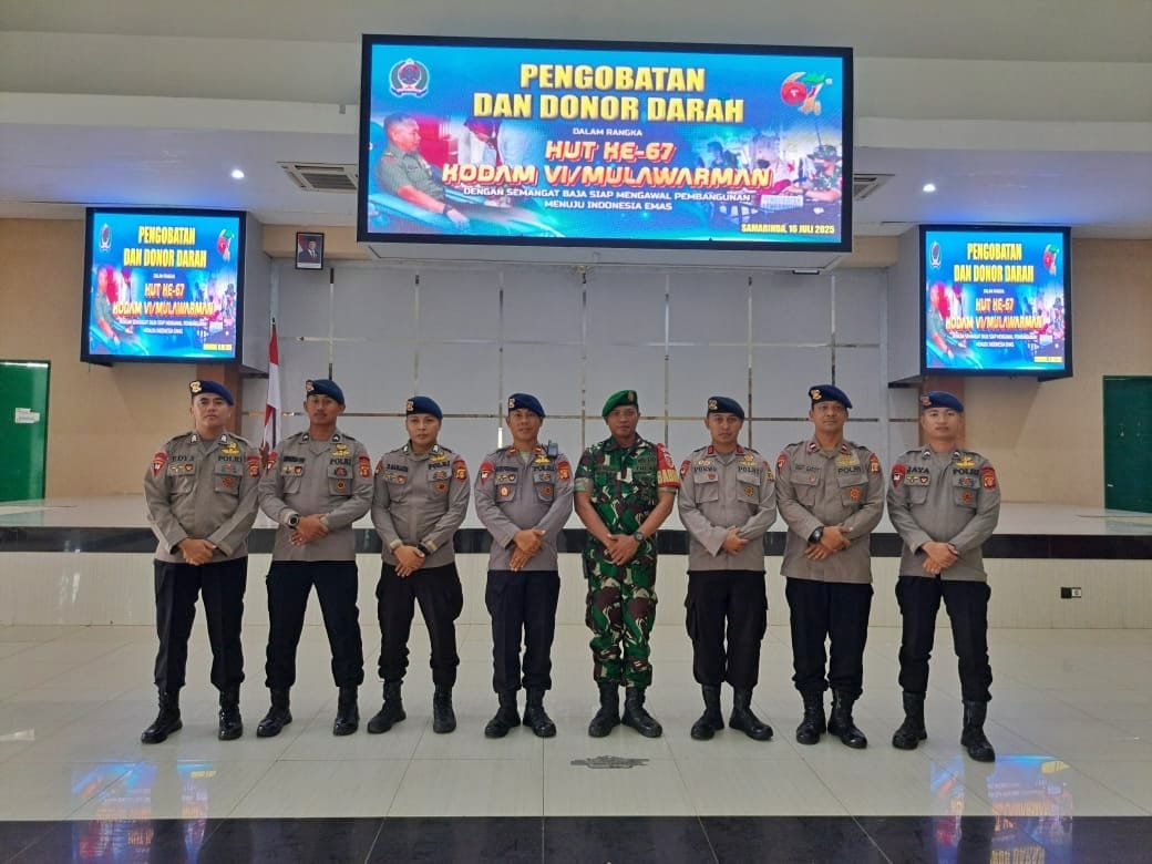 Dalam rangka memperingati Hari Ulang Tahun (HUT) ke-67 Kodam VI/Mulawarman, personel Batalyon B Pelopor Satuan Brimob Polda Kalimantan Timur turut ambil bagian dalam kegiatan donor darah yang diselenggarakan di Aula Wira Yudha Korem 091/ASN, Kota Samarinda, Rabu (16/7/2025).