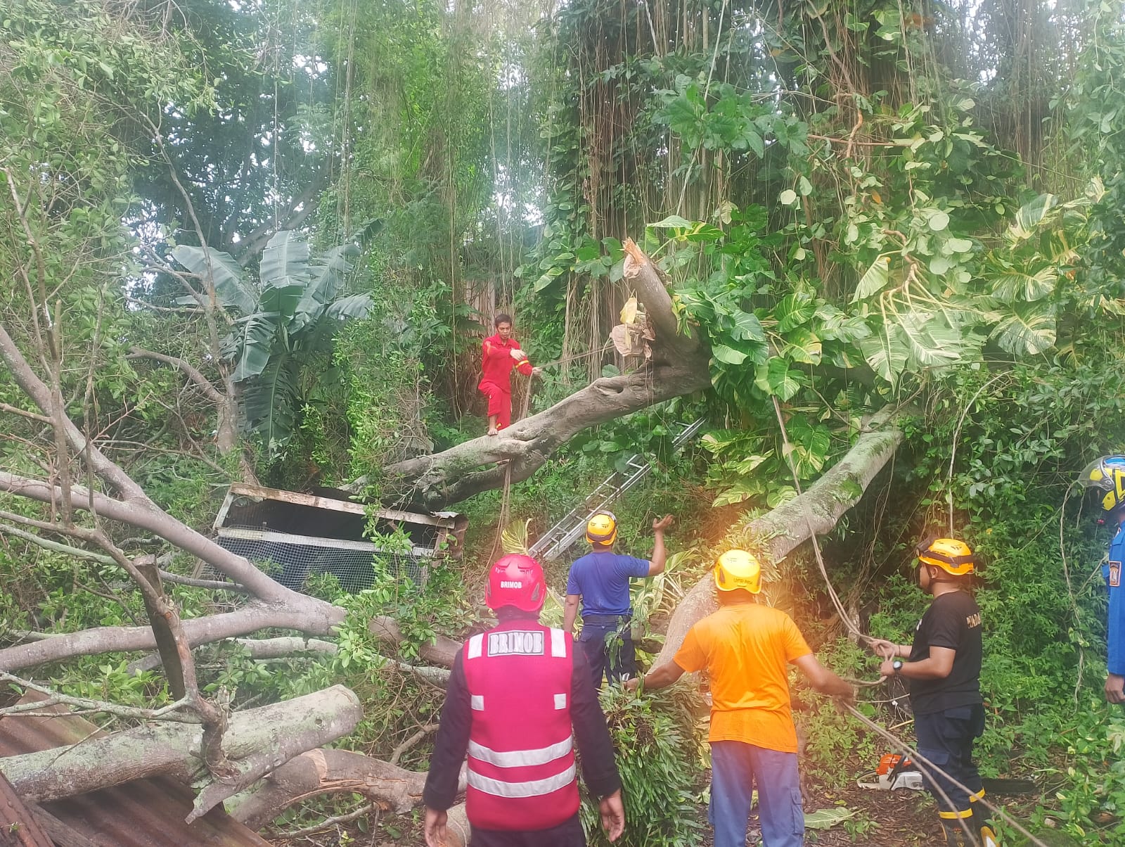 Personel Batalyon A Pelopor Sat Brimob Polda Kaltim dengan cepat merespons laporan pohon tumbang dari masyarakat di RT.16, Kelurahan Telagasari, Balikpapan Kota, Selasa (17/12/24) siang. Bersama dengan BPBD Kota Balikpapan, Batalyon A bekerja sama untuk melakukan pengamanan, pemotongan dahan, dan ranting pohon yang tumbang guna memastikan jalur tetap aman bagi para pengendara.