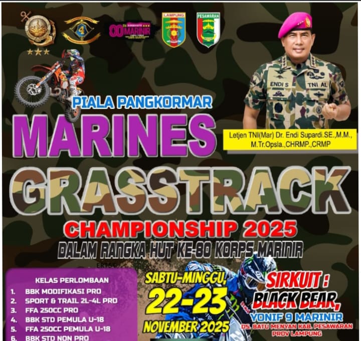 Dalam rangka memajukan olahraga otomotif di Indonesia, khususnya di wilayah Lampung, akan digelar Kejuaraan Marine Grasstrack Championship 2025 memperebutkan Piala Pangkormar. Ajang bergengsi ini akan berlangsung di Sirkuit Black Bear Yonif 9 Marinir, Desa Batumenyan, Kecamatan Teluk Pandan, Kabupaten Pesawaran, Lampung, pada Sabtu dan Minggu, 22–23 November 2025.