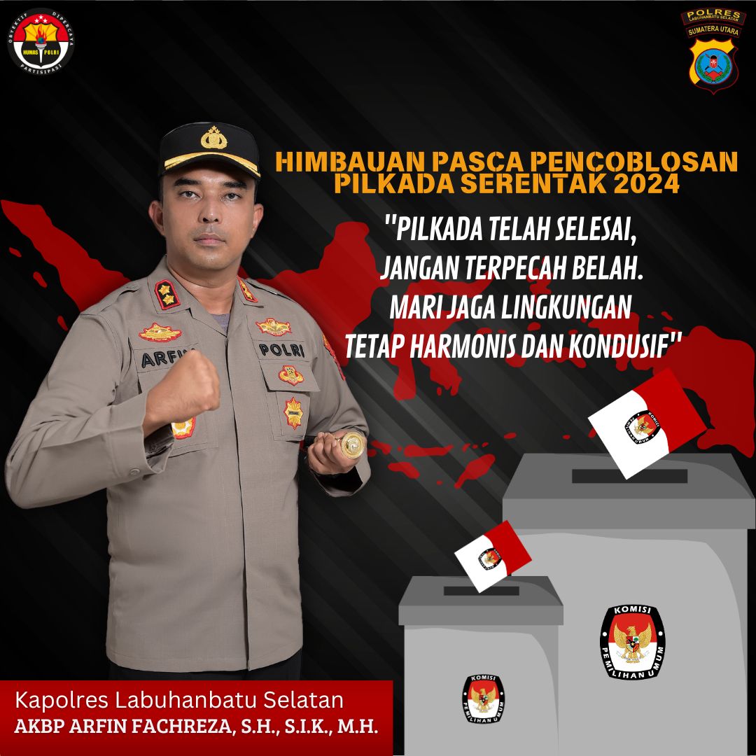 Setelah berakhirnya gelaran Pemilihan Kepala Daerah (Pilkada), Kapolres Labuhanbatu Selatan AKBP Arfin Fachreza, S.H., S.I.K., M.H., menyerukan kepada masyarakat untuk kembali bersatu dan menjaga keharmonisan di lingkungan masing-masing. Dalam pernyataannya, ia mengingatkan pentingnya memprioritaskan persaudaraan di atas perbedaan pilihan politik.