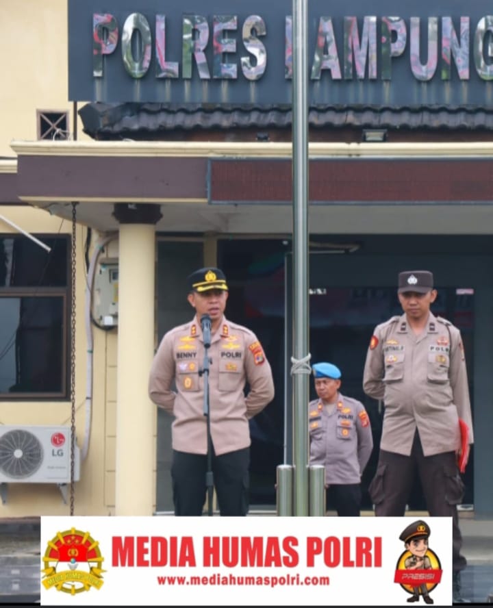 Kapolres Lampung Timur, AKBP Benny Prasetya, memimpin apel pagi di Lapangan Satya Haprabu Polres Lampung Timur, Senin (20/1/25). Dalam arahannya, Kapolres menekankan pentingnya kewaspadaan seluruh personel dalam menghadapi cuaca ekstrem yang tengah melanda wilayah Lampung Timur.