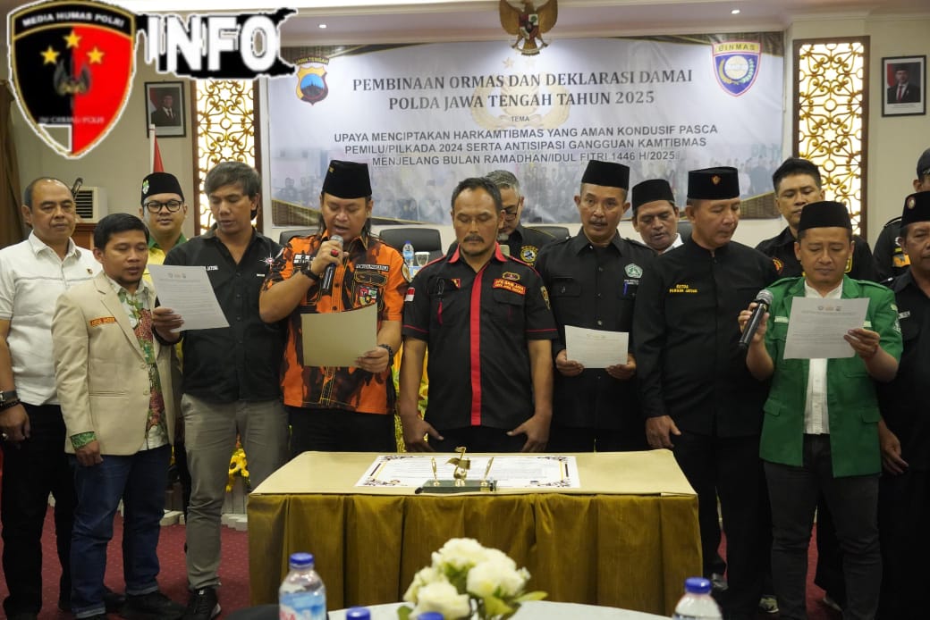 Sebagai upaya menjaga harkamtibmas di Jawa Tengah pasca Pemilu/Pilkada 2024 serta mengantisipasi potensi gangguan menjelang bulan Ramadan dan Idulfitri 1446 H, Polda Jawa Tengah menggelar kegiatan Pembinaan Ormas dan Deklarasi Damai Tahun 2025 yang berlangsung di Hotel Plaza, Banyumanik, Kota Semarang, pada Rabu (12/2/2025). Kegiatan ini juga bertujuan untuk memperkuat sinergi antara kepolisian dan organisasi kemasyarakatan (ormas) untuk mendukung program dan kebijakan pemerintahan yang baru dengan menjaga kondusifitas keamanan di wilayah masing-masing.