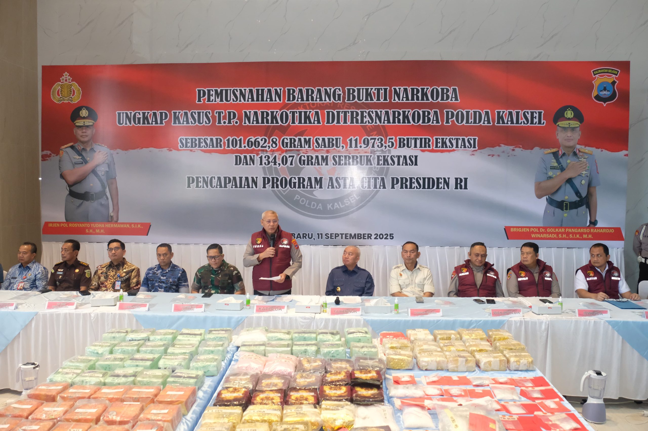 Kepolisian Daerah Kalimantan Selatan (Polda Kalsel) menggelar pemusnahan barang bukti narkoba jenis sabu, ekstasi, dan serbuk ekstasi dari 45 laporan polisi yang telah ditangani. Pemusnahan secara simbolis dilakukan di Lobby Mapolda Kalsel, pada Kamis (11/9/2025).