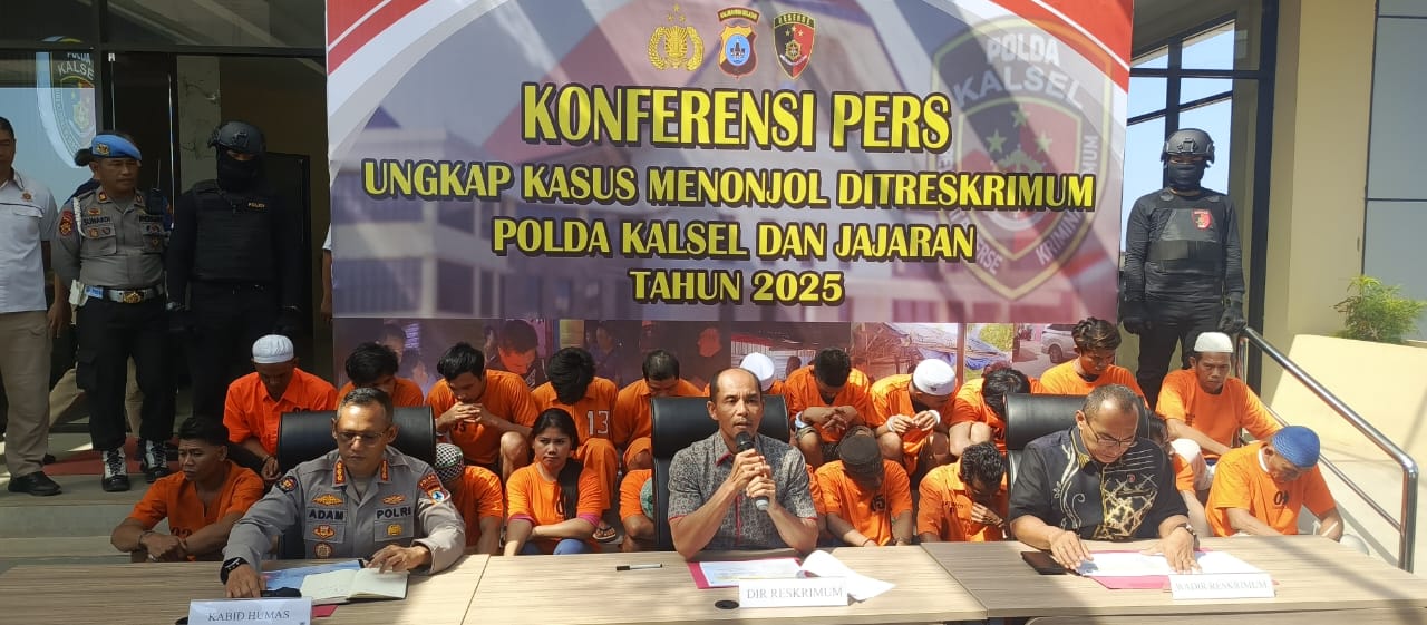 Kepolisian Daerah Kalimantan Selatan (Polda Kalsel) menggelar konferensi pers terkait pengungkapan kasus penganiayaan dan pembunuhan yang melibatkan 26 tersangka. Konferensi pers digelar di lobi Direktorat Reserse Kriminal Umum (Ditreskrimum) Polda Kalsel, Banjarbaru, Jumat (25/7/2025).